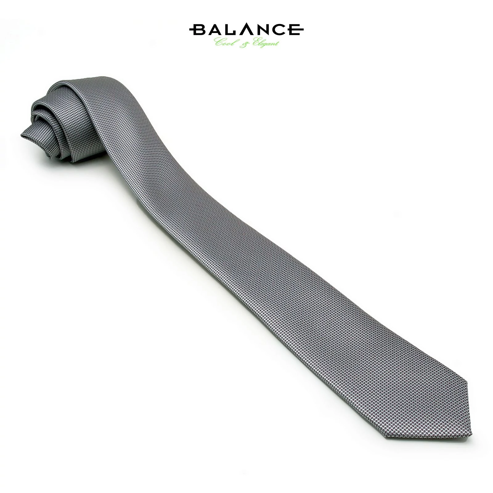 Divatos, keskeny férfi selyem nyakkendő a Balance kínálatából, apró fekete pöttyös, anyagában szövött mintás ezüstszürke színű, finoman fénylő felülettel.