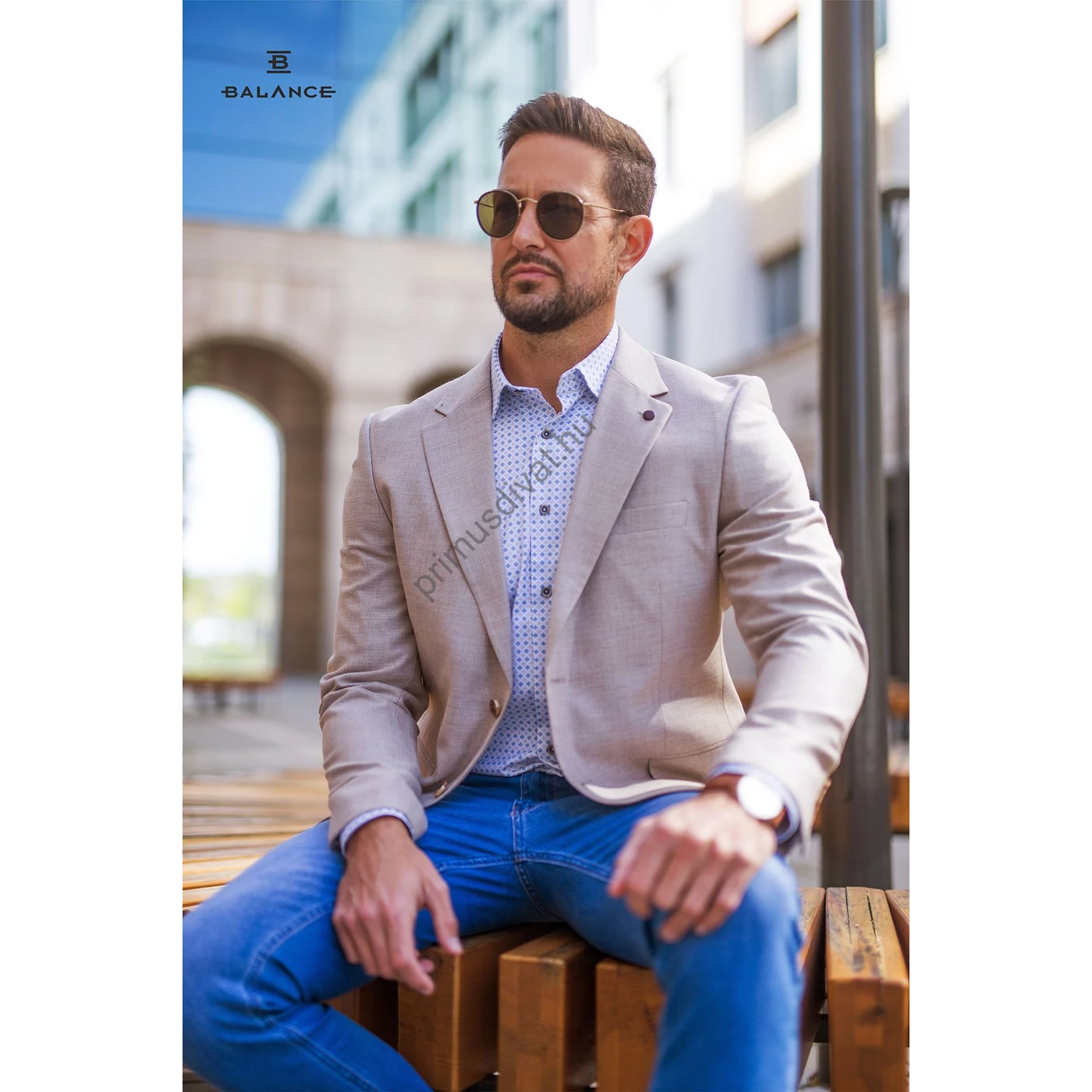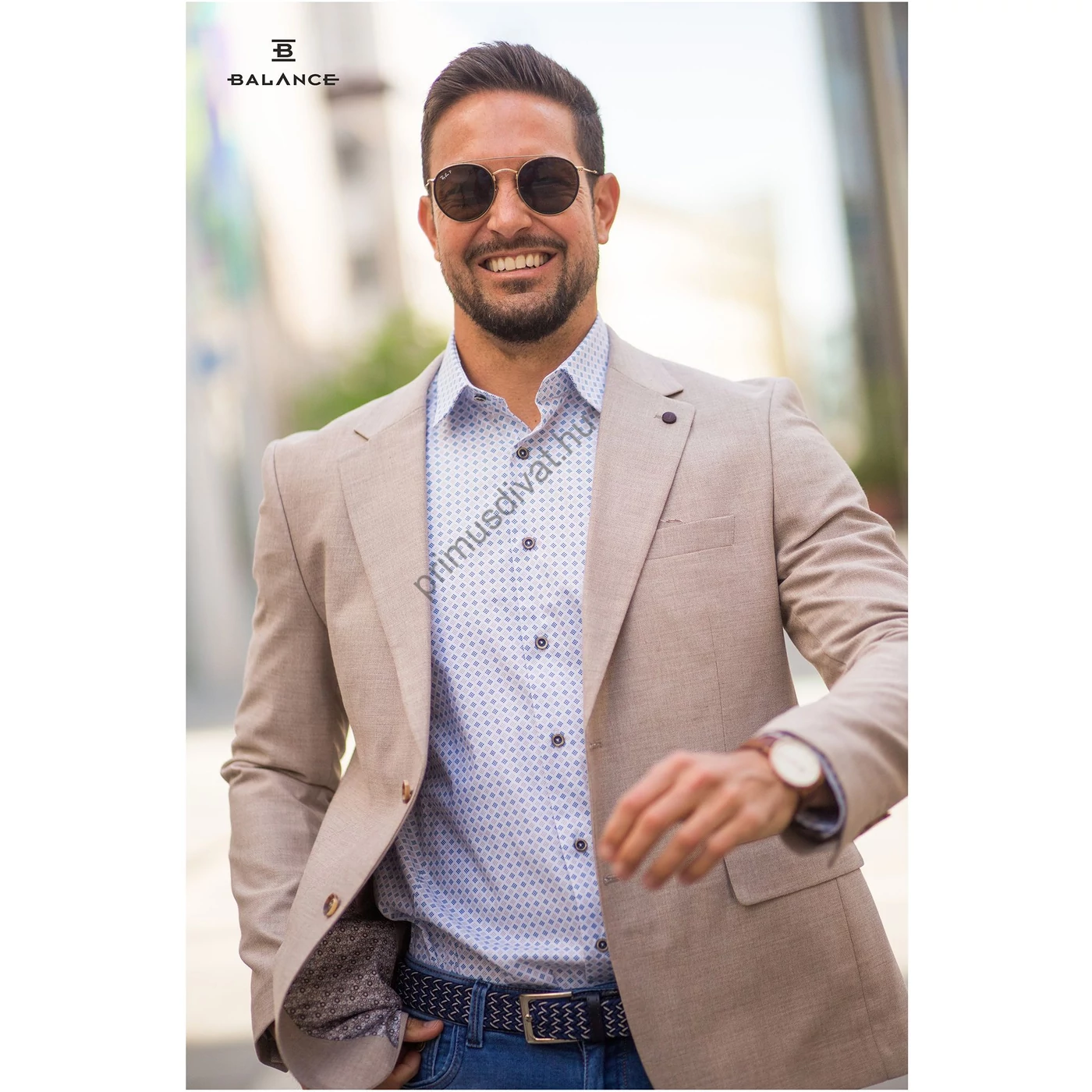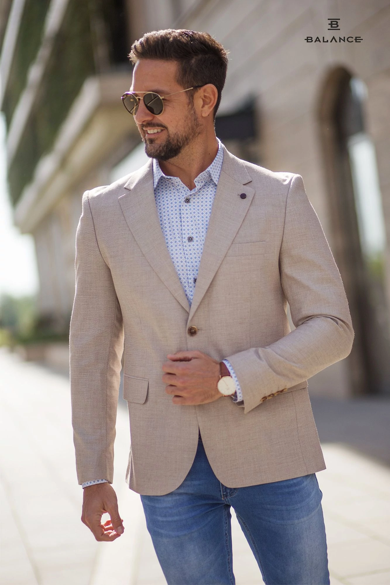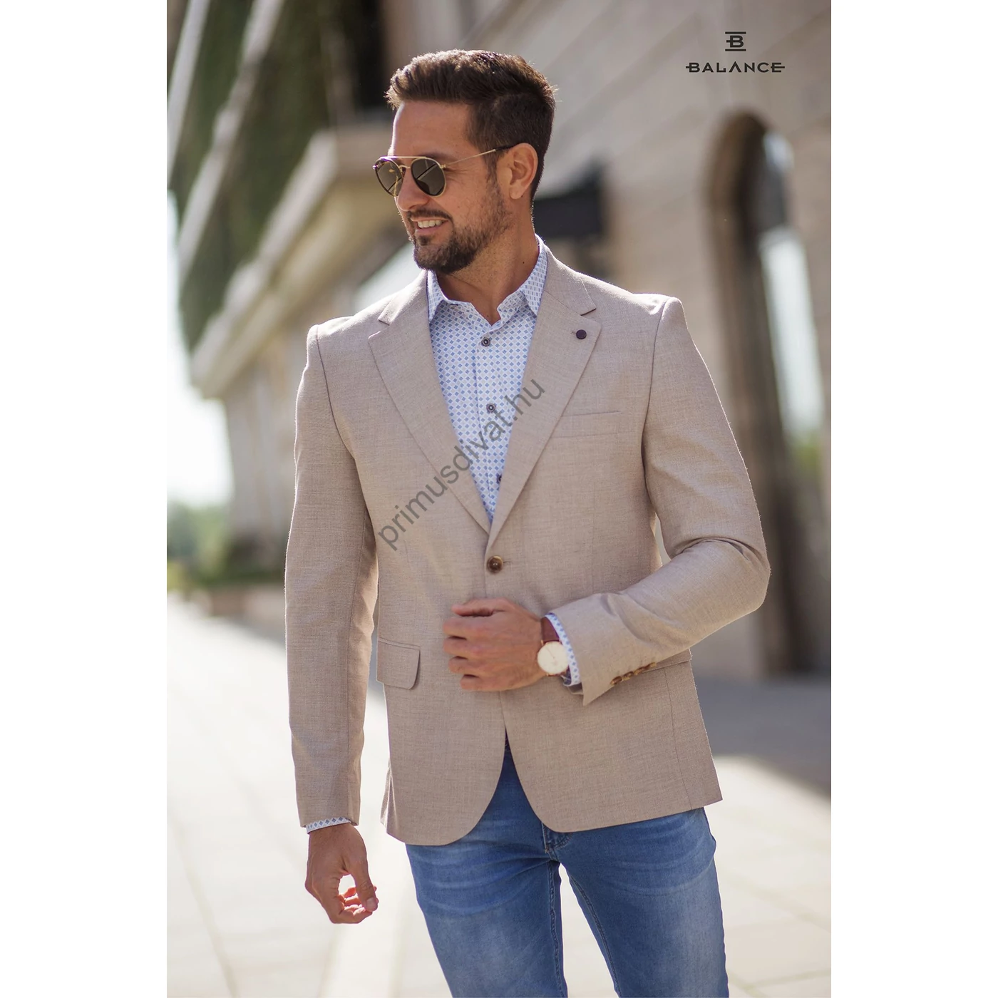 Balance béleletlen, pamut-len anyagú, két gombos, két slicces karcsúsított bézs Queb nyári zakó. Háta bélés nélküli, kellemes nyári viselet. Kényelmes, jó szabású zakó, a hátán két slicc található. Igényes belső kidolgozással, mintás bélés selyemmel készült. A modell 180 cm, 80kg, sportos testalkatú és 50-es méretű zakót visel.