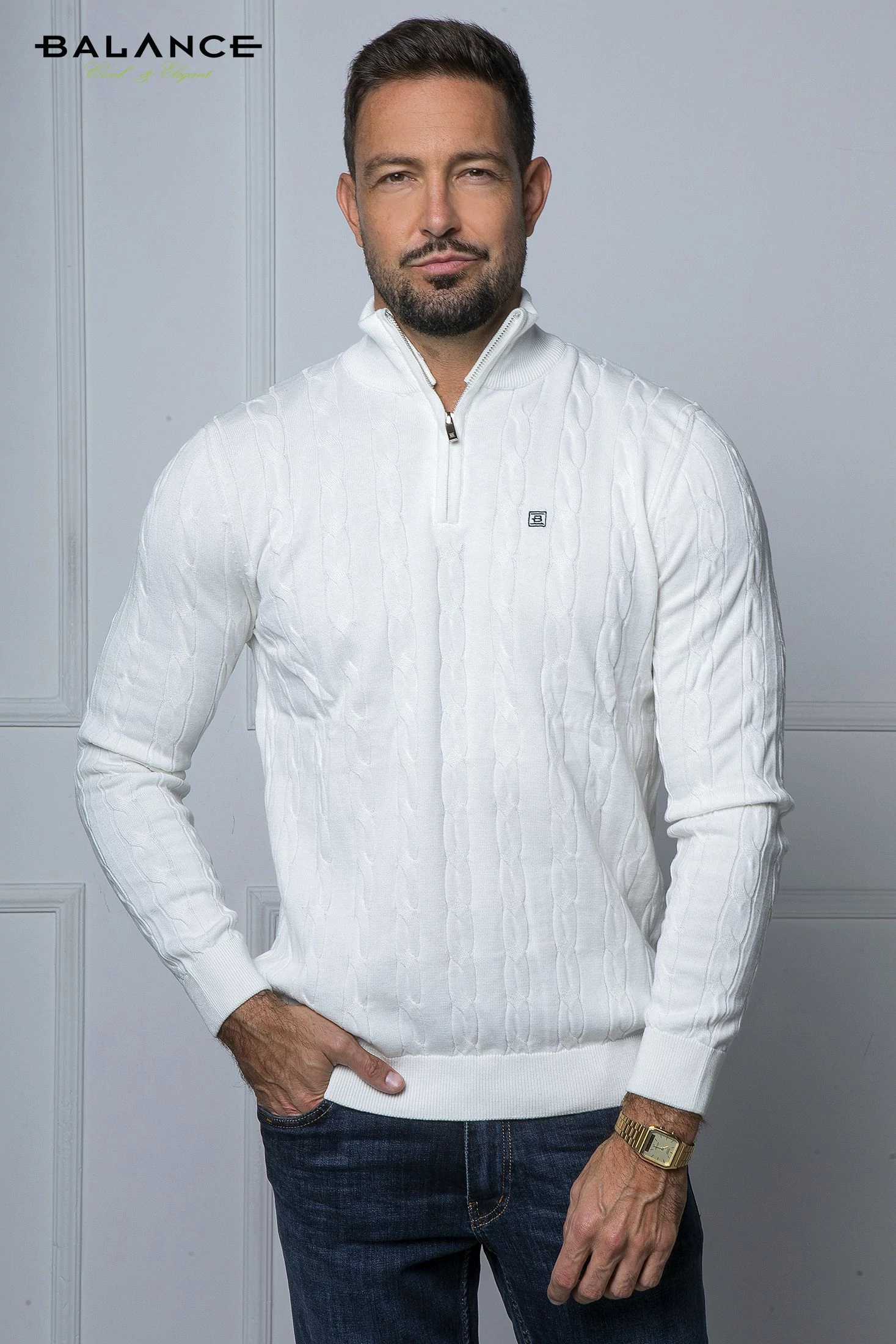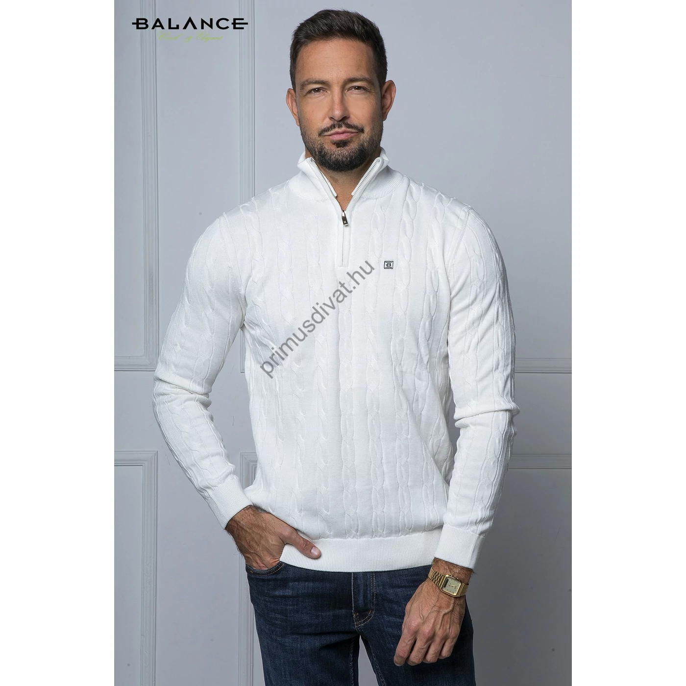 Balance cipzáras nyakú, állógalléros, fonott mintás kötött törtfehér Fonner pulóver, ujjain és derekán szűkebb passzé résszel, nyaka belső oldalán kontrasztos színű kötéssel, mellén szolid hímzett Balance monogrammal. Gallérja letűrhető, önmagában, de akár ing fölé is viselhető. A modell 183 cm, 75kg, sportos testalkatú és L méretű pulóvert visel.