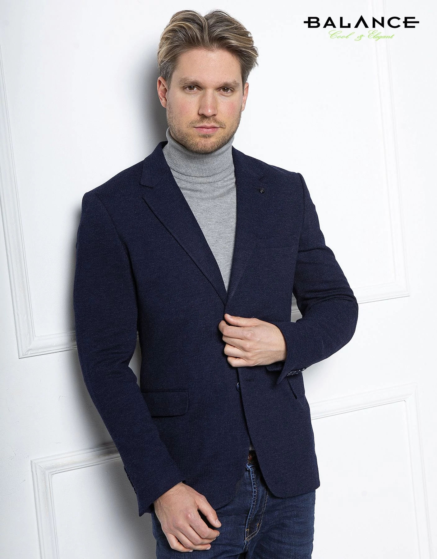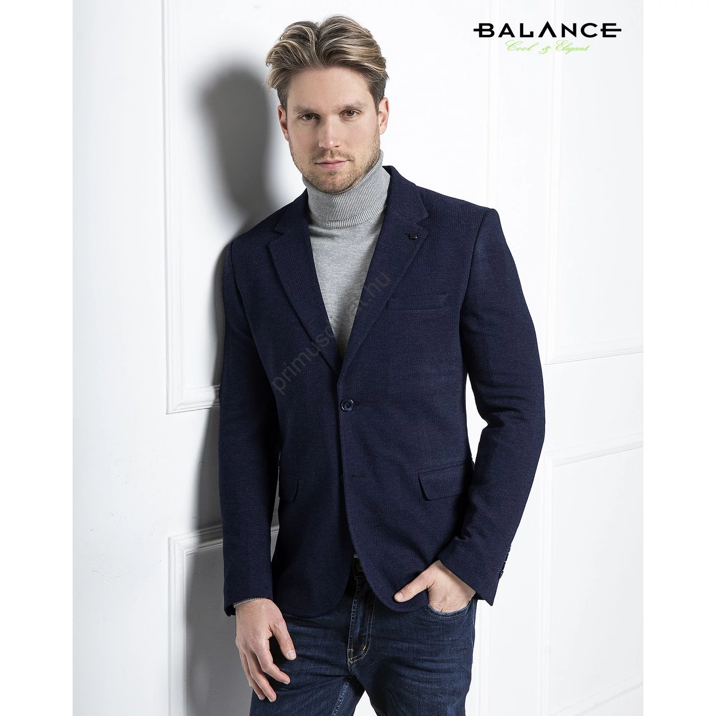 Balance extra rugalmas, szövött pamut anyagú, strukturált felületű sötétkék színű karcsúsított Woller zakó. Két gombos, hátul két slicces kivitel. Nagyon kényelmes viselet, igényesen kidolgozott színes bélésű belső résszel.