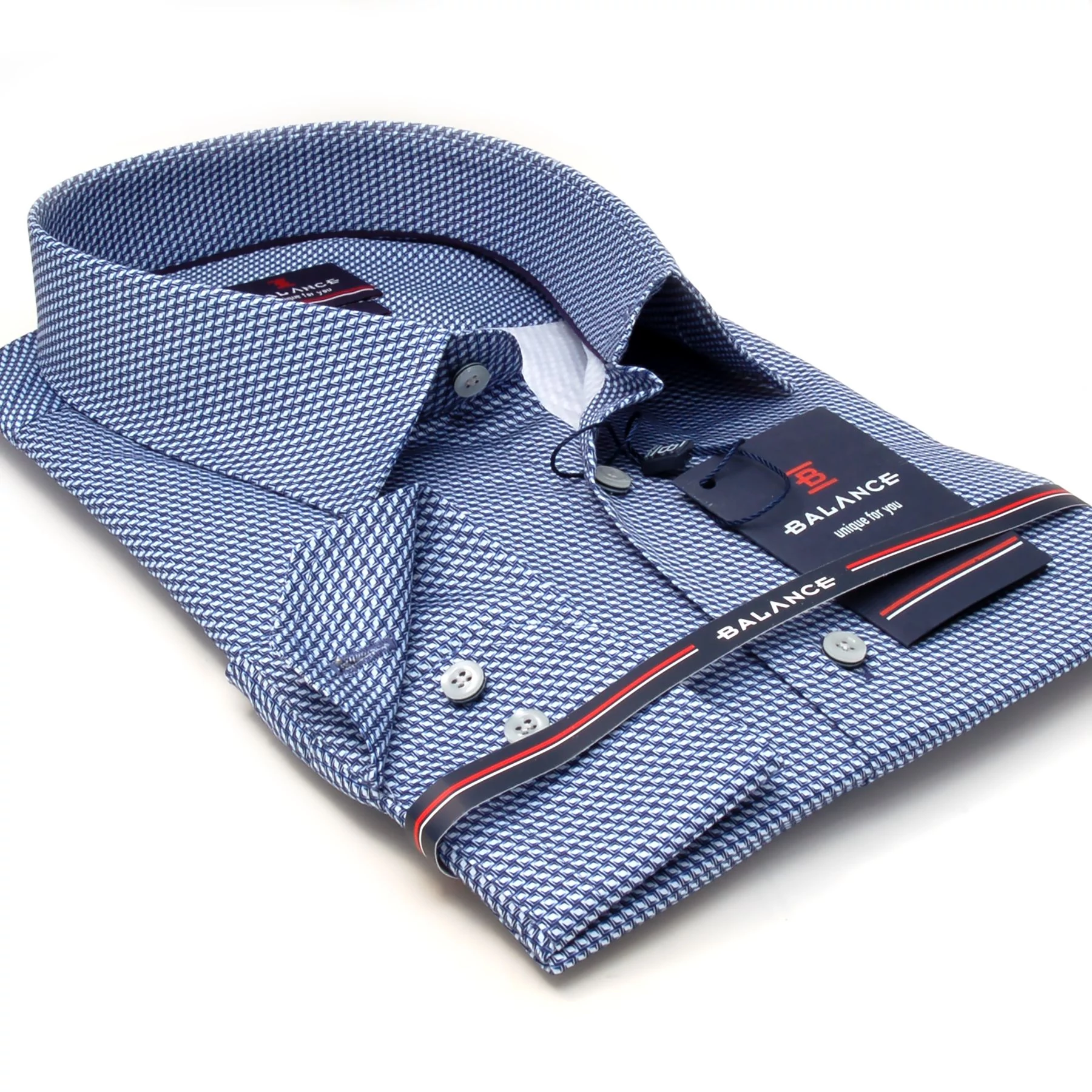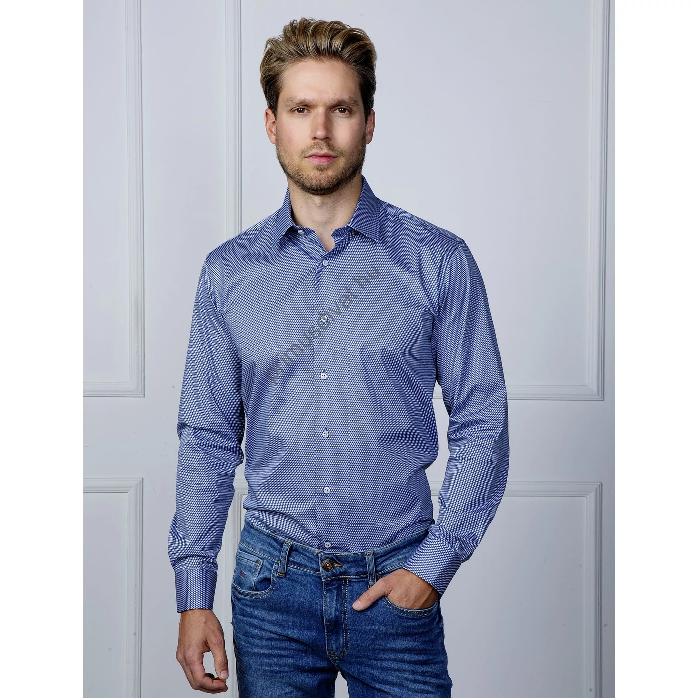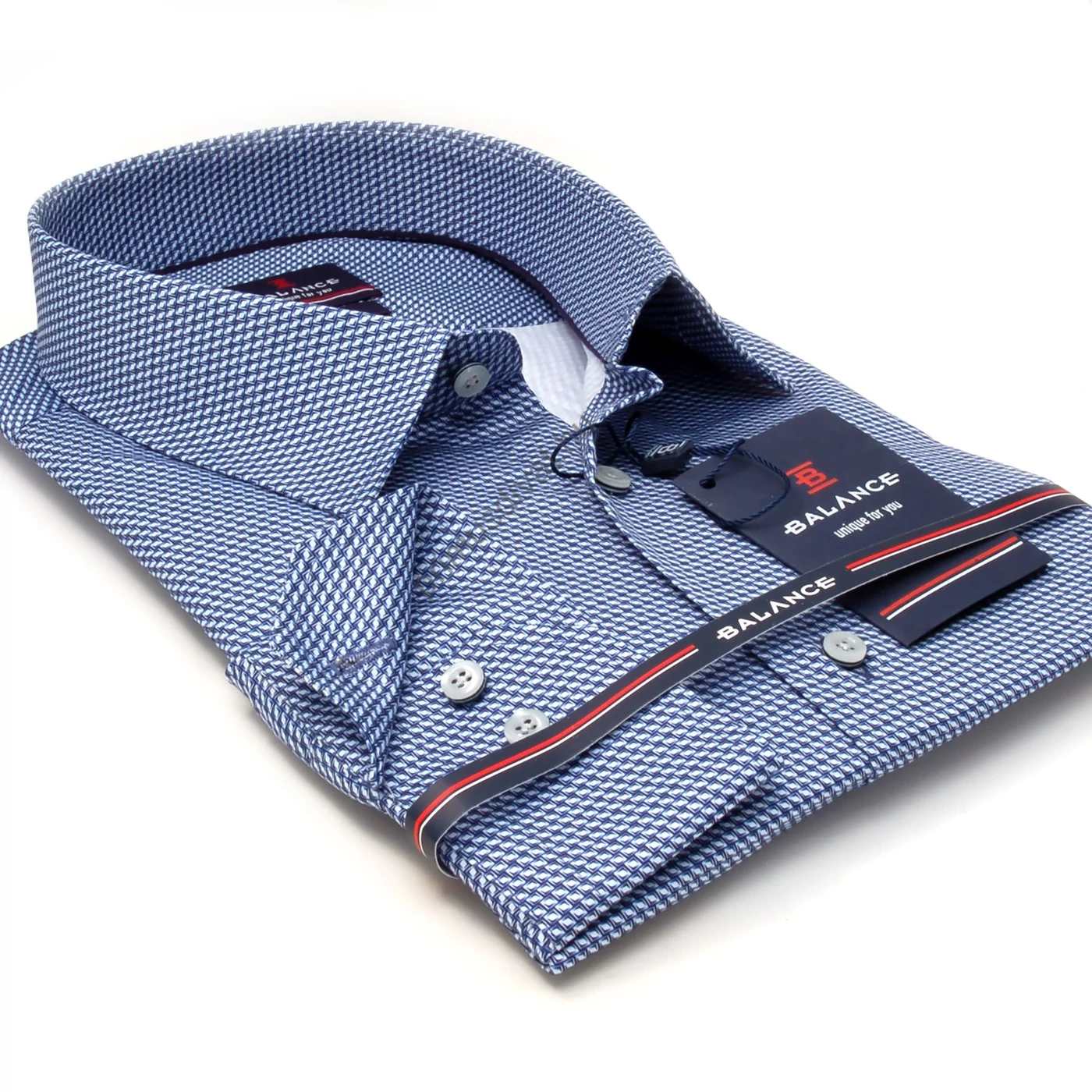 Balance fehér alapon nyomott sötétkék aprómintás hosszú ujjú karcsúsított Mali slim-fit ing, selymes tapintású, vasaláskönnyített prémium pamut anyagból. Jobb mandzsettáján Balance monogram hímzés található.