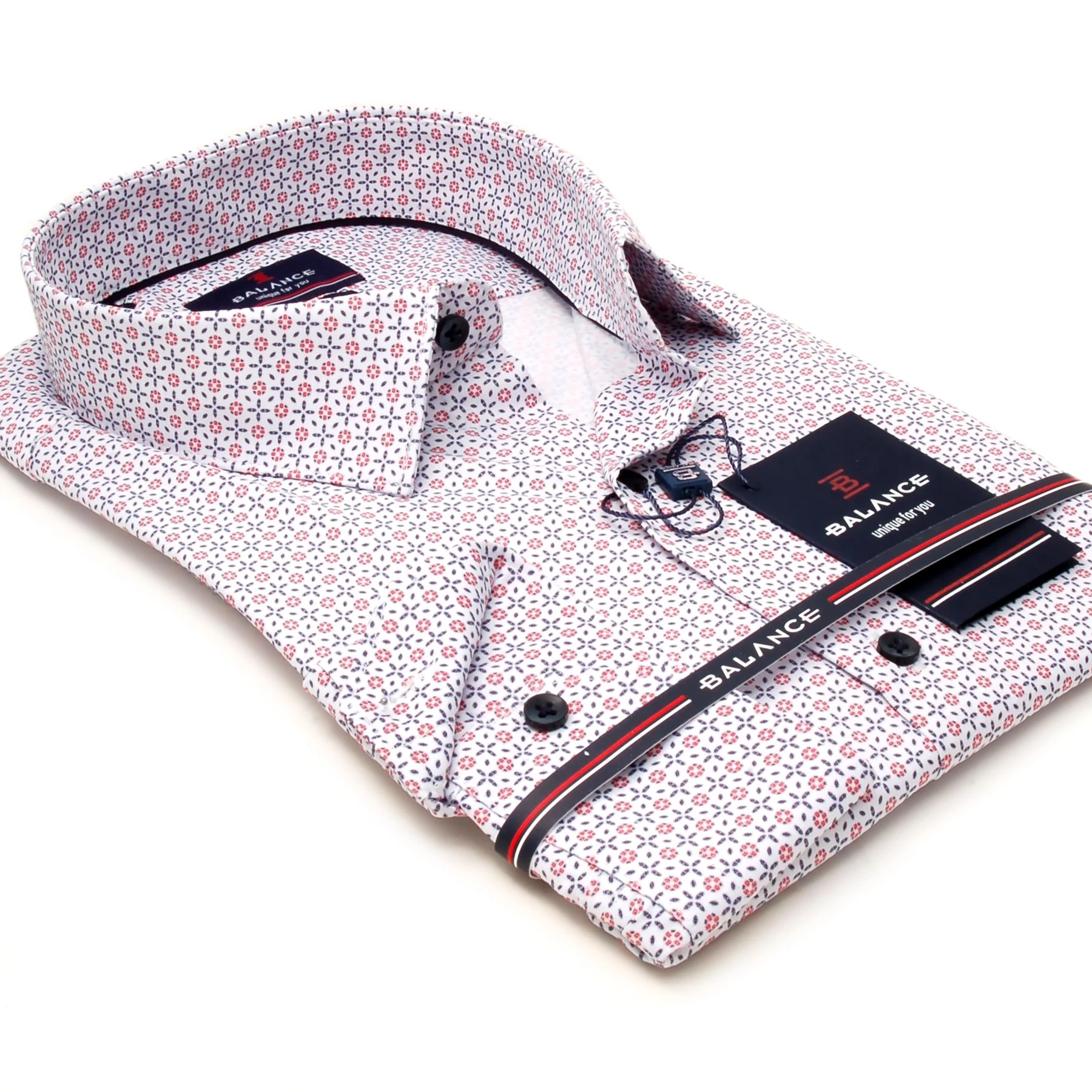Hagyományos szabásvonalú, bő fazonú, regular fit, fehér alapon nyomott szürke-bordó apró mintás, rugalmas anyagú hosszú ujjú alkalmi Porem ing a Balance kínálatából, mandzsettáján kis Balance monogram hímzéssel. Vasaláskönnyített anyag.