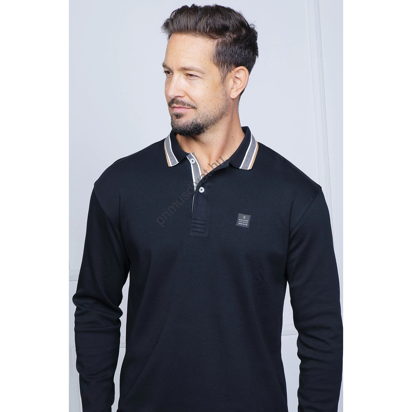 Balance galléros-gombos nyakú sötétkék puha pamut anyagú hosszú ujjú Craig ingpóló, pulóver, kontrasztos színű, extra kötésű gallérral és gombolópánttal, mellén kis Balance feliratos címkével. Regular fit, lazább fazon, így a szokásosnál egyel kisebb rendelését ajánljuk. A modell 183 cm, 75kg, sportos testalkatú és M méretű pólót visel.