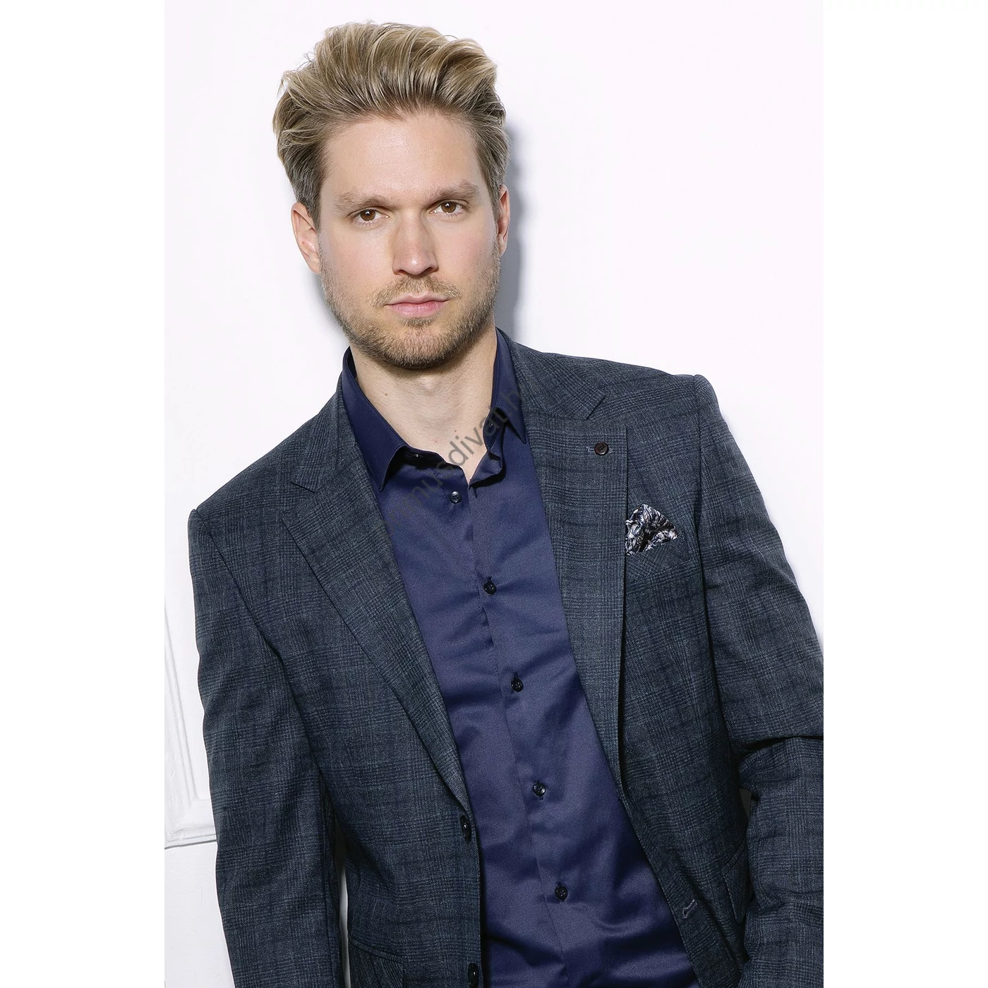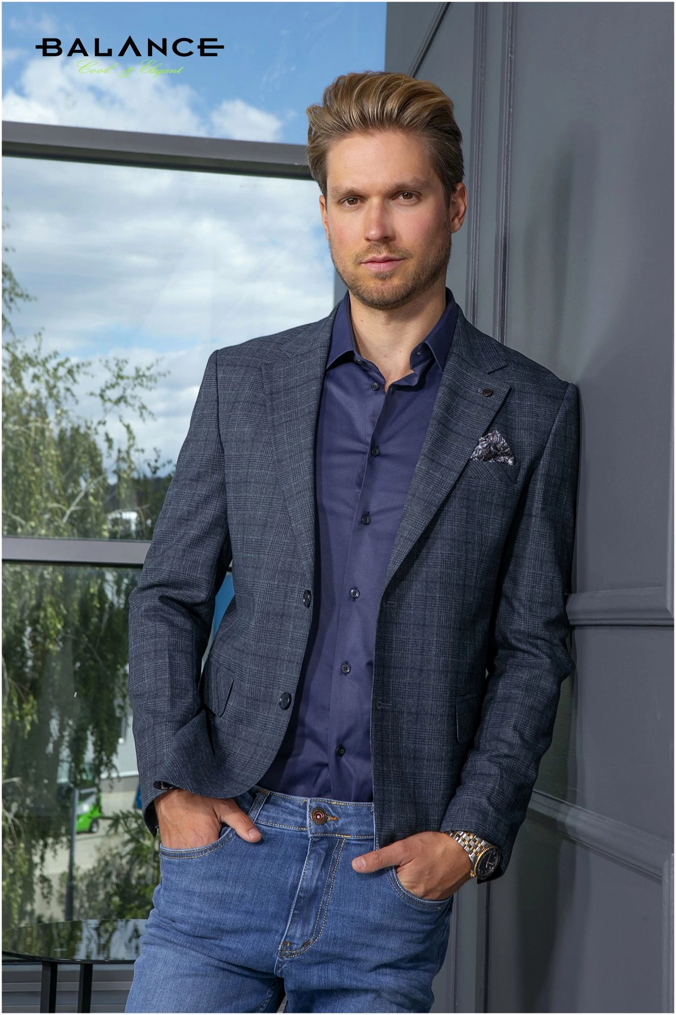 Balance kék négyzetrács mintás (kockás) rugalmas szövet anyagú két gombos, két slicces karcsúsított Loeben zakó. Könnyű, enyhén rugalmas anyagból készült, igényesen kidolgozott béleléssel. Hátul dupla slicces, a mell zseb bélése díszzsebkendőként kifordítható. Slim fit, enyhén karcsúsított, kényelmes viselet.