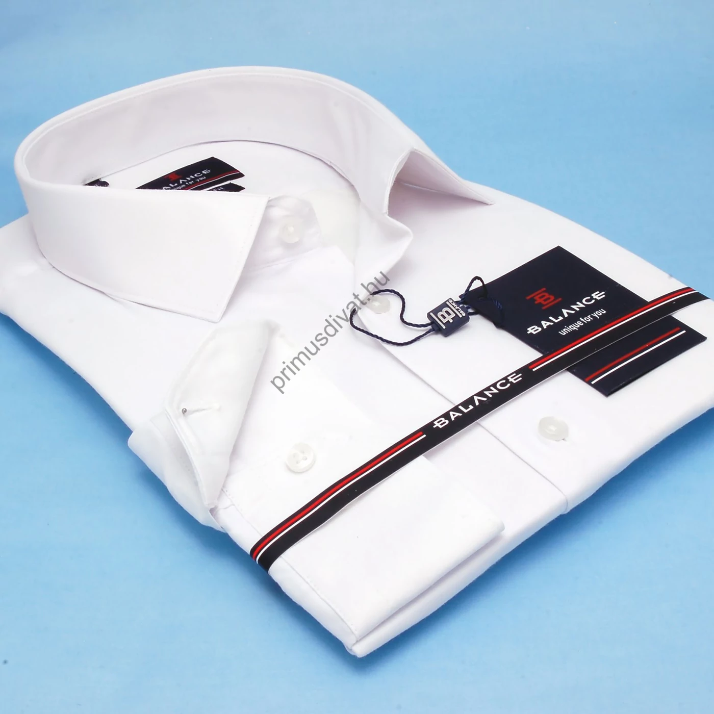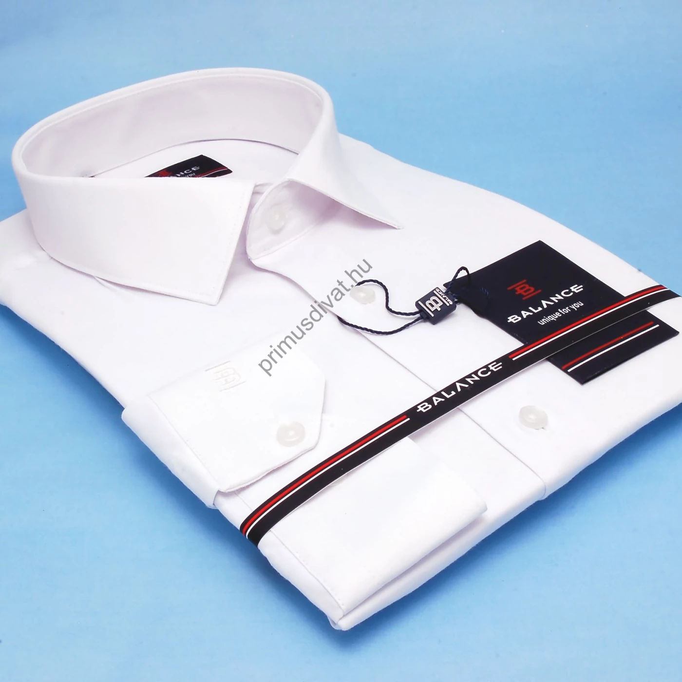 Hagyományos szabásvonalú, bő fazonú, normál galléros fehér, finoman fénylő felületű rugalmas pamutszatén regular-fit hosszú ujjú alkalmi ing, jobb mandzsettáján szín-azonos kis Balance monogram hímzéssel. Vasaláskönnyített anyag.