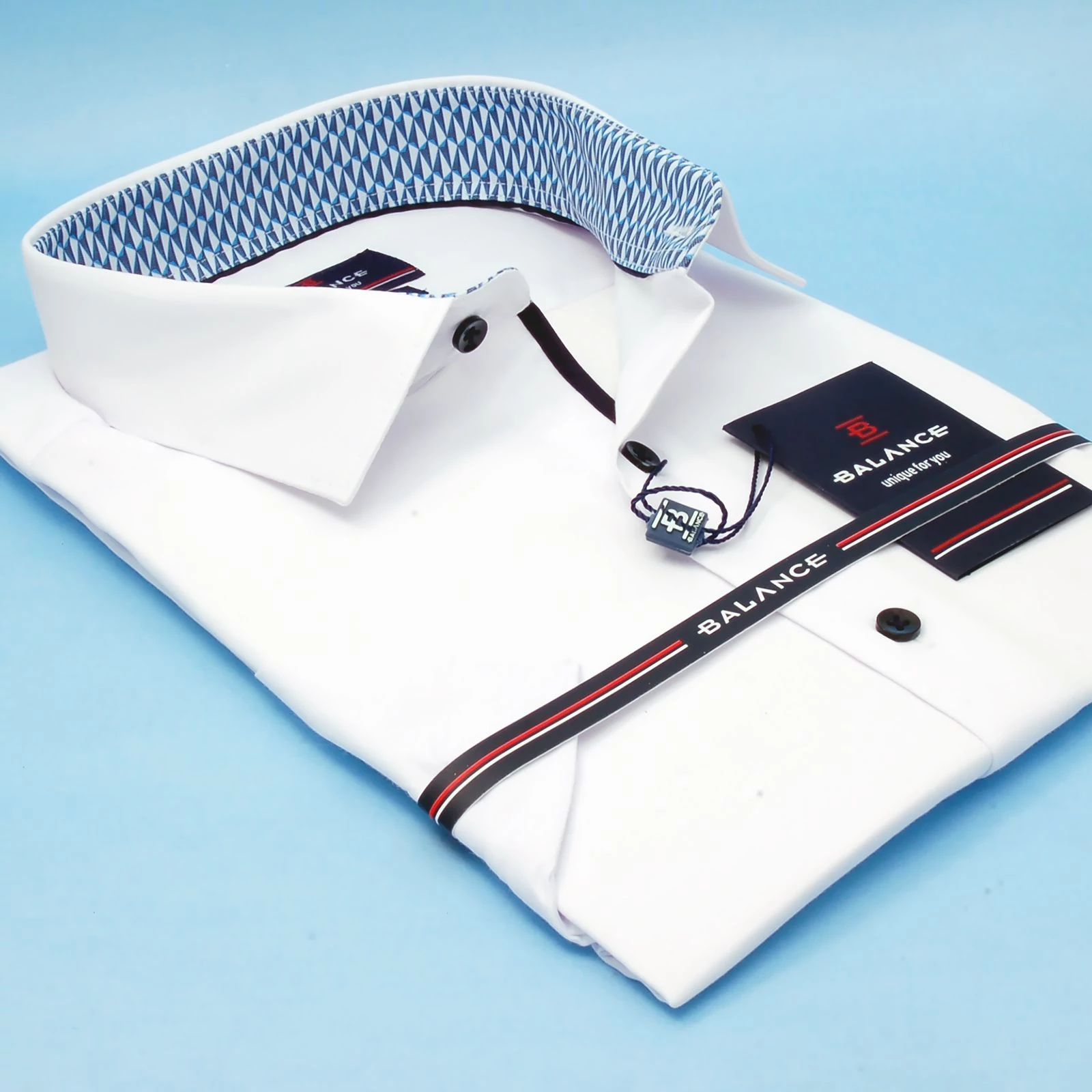 Balance normál galléros, fehér rugalmas pamutszatén, karcsúsított slim-fit rövid ujjú alkalmi Lois ing, nyaka belső oldalán kontrasztos mintás betéttel - Blnc2536she