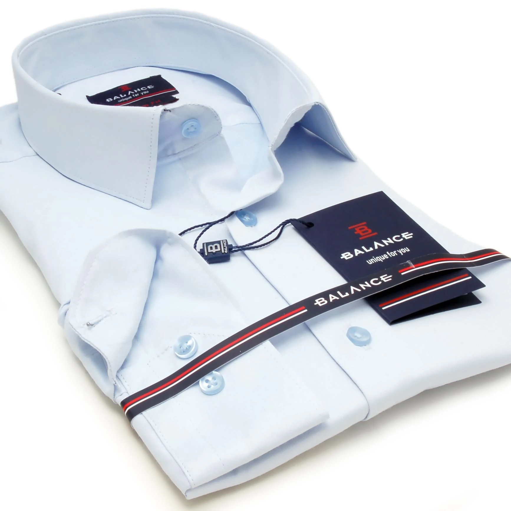 Slim fit, enyhén karcsúsított, kissé fényes felületű, puha anyagú, hosszú ujjú elegáns rugalmas pamutszatén vízkék ing. Normál galléros, mandzsettáján kis Balance monogram hímzéssel díszített.