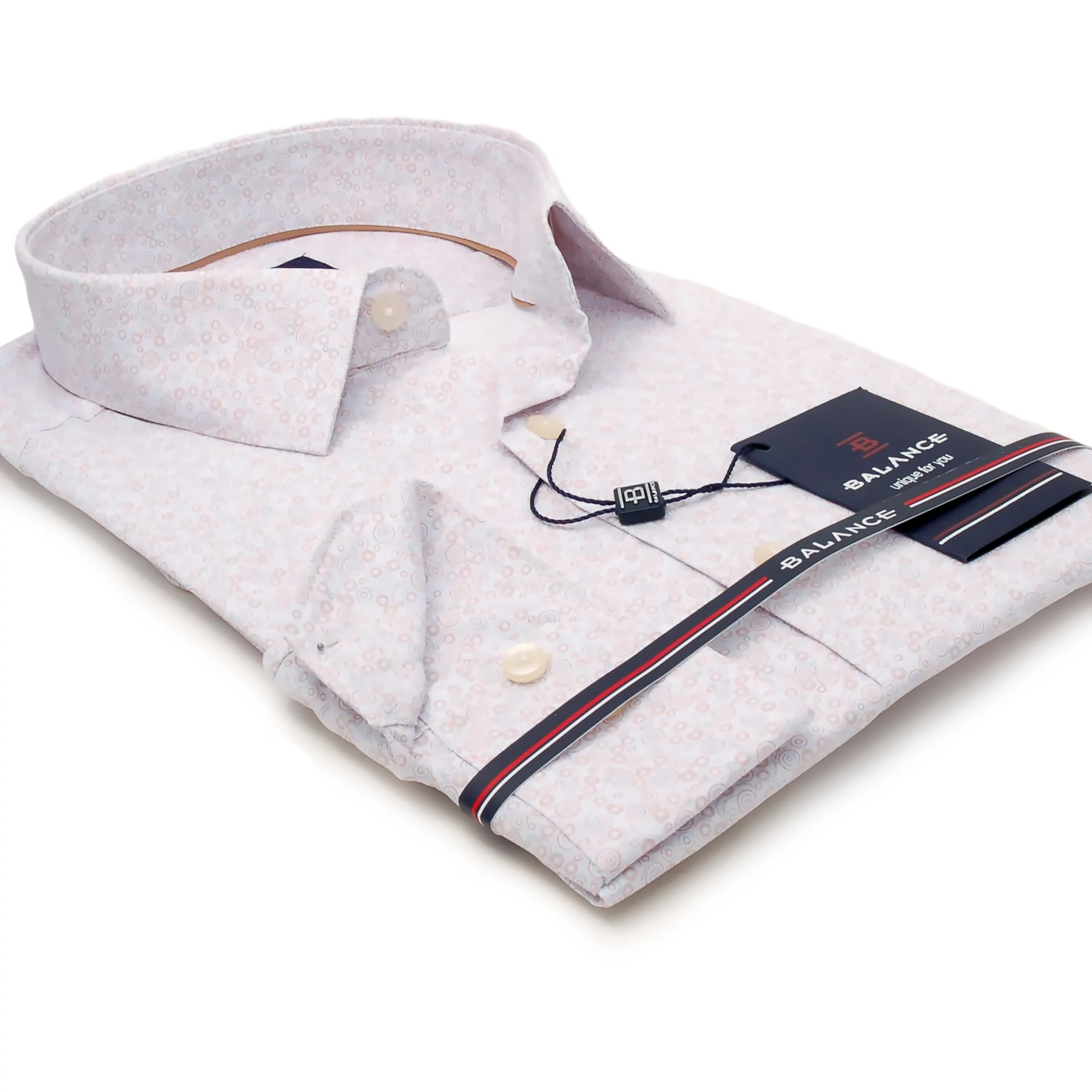 Balance nyomott drapp karikamintás hosszú ujjú, karcsúsított fazonú, rugalmas anyagú Spiral slim-fit ing, vasaláskönnyített prémium pamut anyagból. Jobb mandzsettáján Balance monogram hímzés található. Digitális print-eléssel készült, amely jobb minőséget tud produkálni, mint a hagyományos nyomással készült alapanyag.