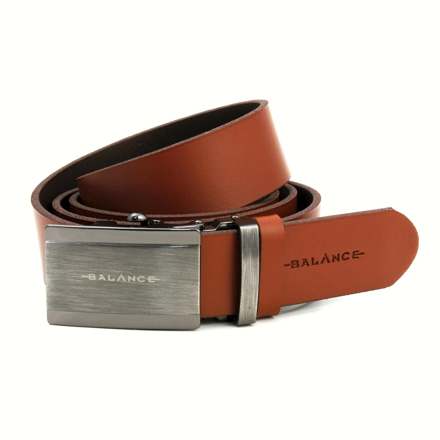 Balance önzáródó, csiszolt telecsatos, egyrétegű barna marhabőr öv, derékszíj, gravírozott márkafelirattal, a szíj végén belepréselt Balance felirattal. A szíj a csaton lévő retesz segítségével fokozatmentesen záródik.