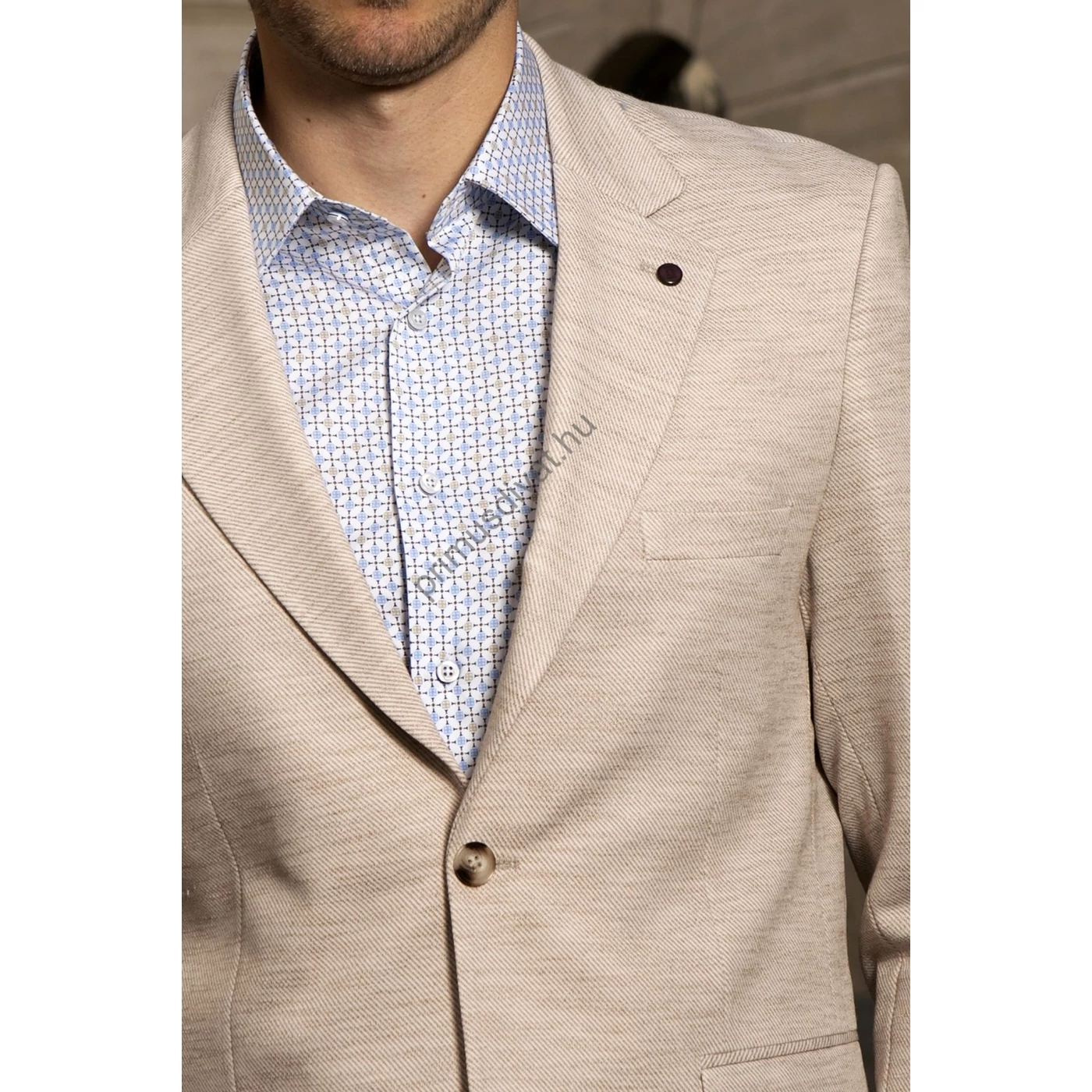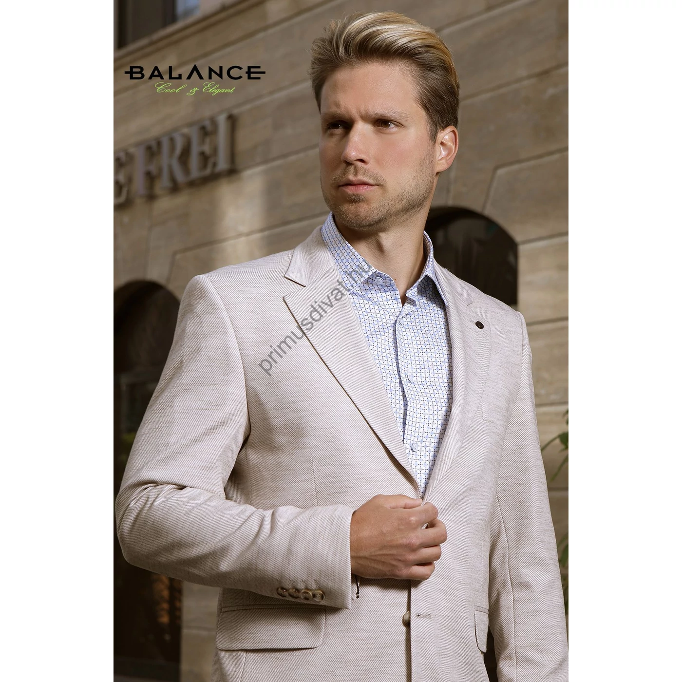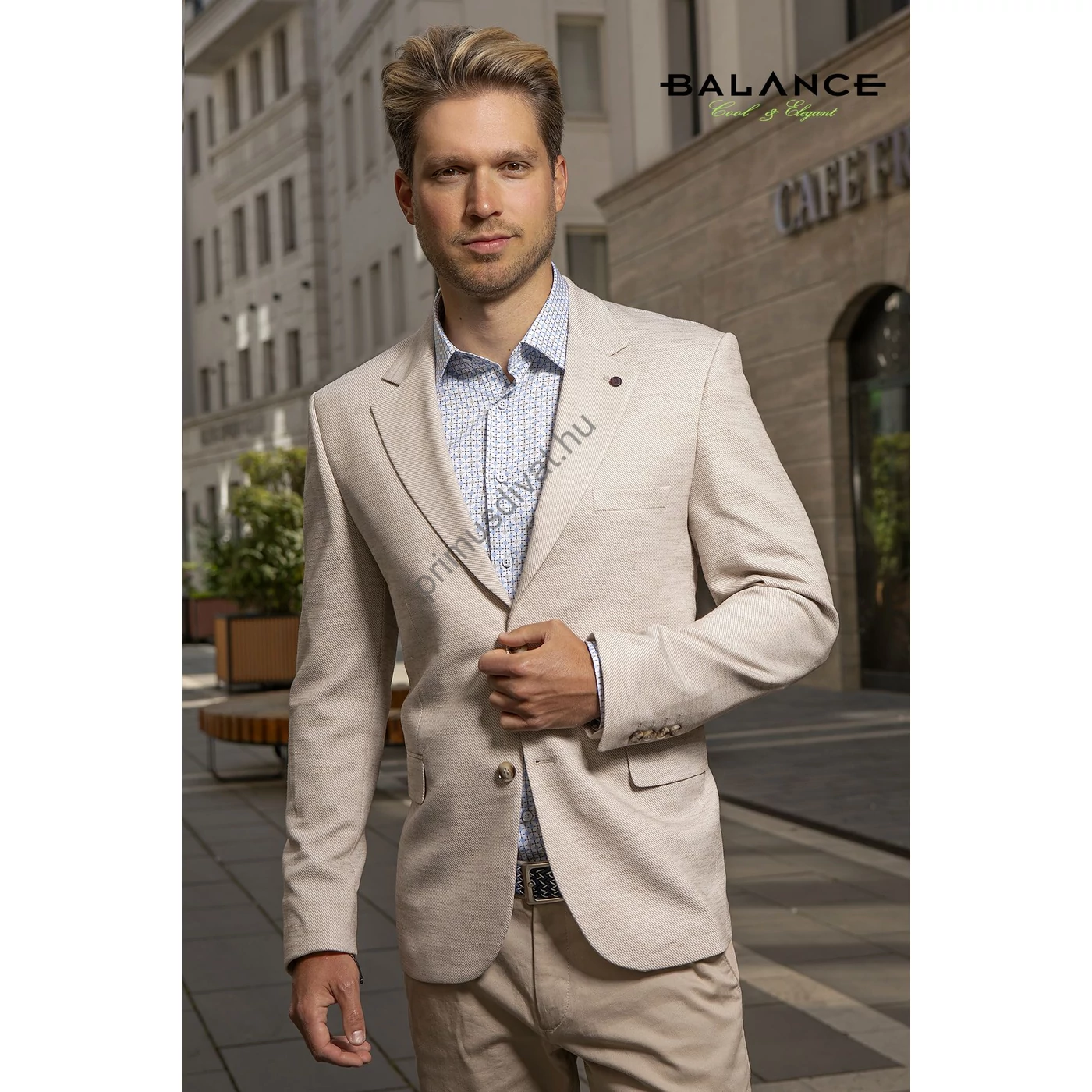 Balance rugalmas pamut anyagú karcsúsított, két slicces, két gombos, strukturált felületű drapp Zua nyári zakó. Kényelmes, jó szabású zakó, kellemes nyári viselet, a hátán két slicc található. Igényes belső kidolgozással, mintás bélés selyemmel készült. A modell 183 cm, 75kg, vékony, sportos testalkatú és 50-es méretű zakót visel.