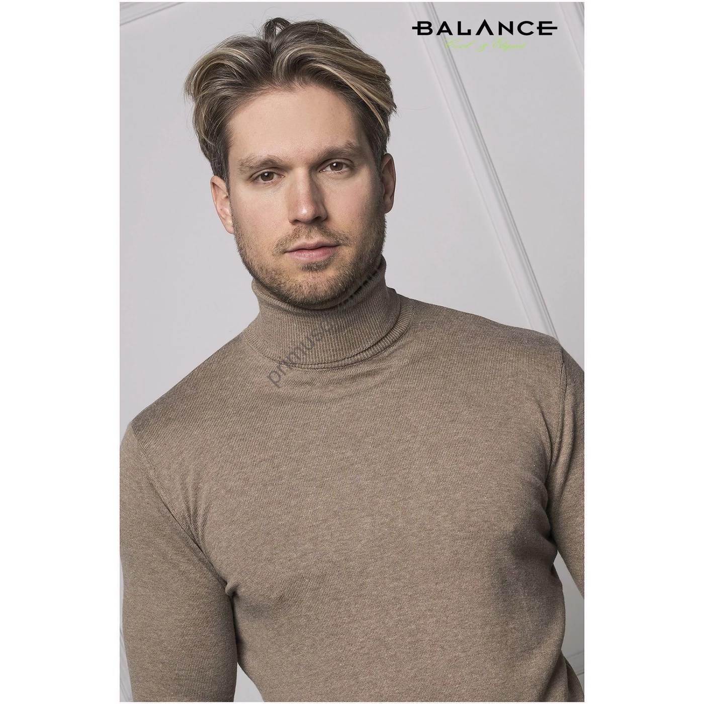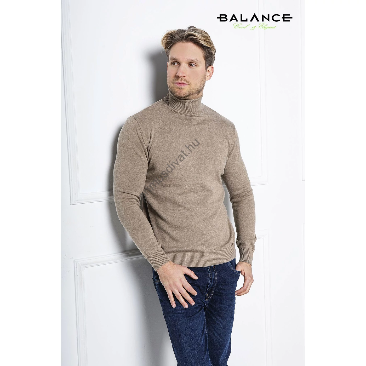 Balance vékony kötött garbós nyakú drapp melange színű pulóver, ujjain és derekán szűkebb passzé résszel, derekán szolid fém Balance logoval. Zakó alá remek választás.