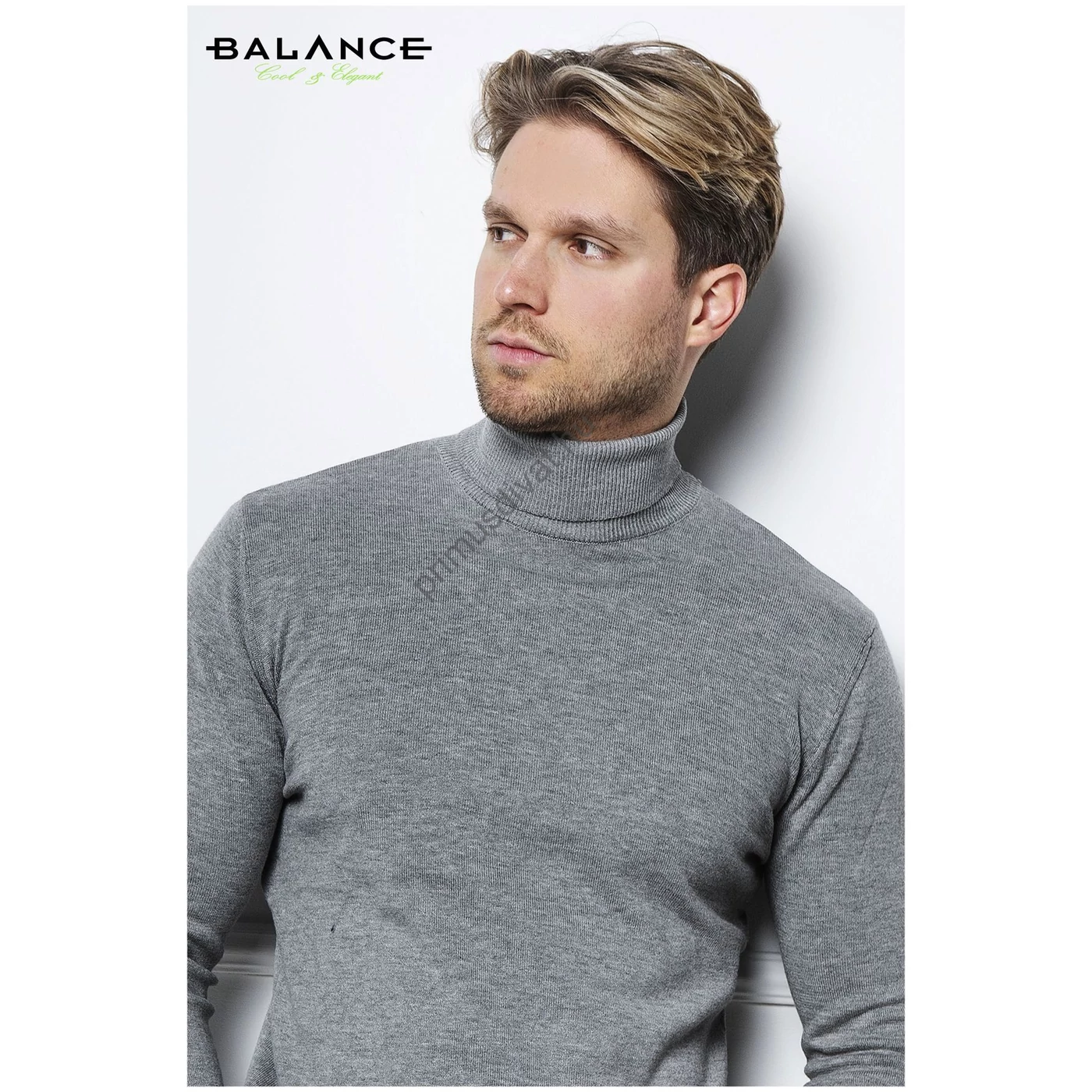 Balance vékony kötött garbós nyakú világosszürke melange színű pulóver, ujjain és derekán szűkebb passzé résszel, derekán szolid fém Balance logoval. Zakó alá remek választás.