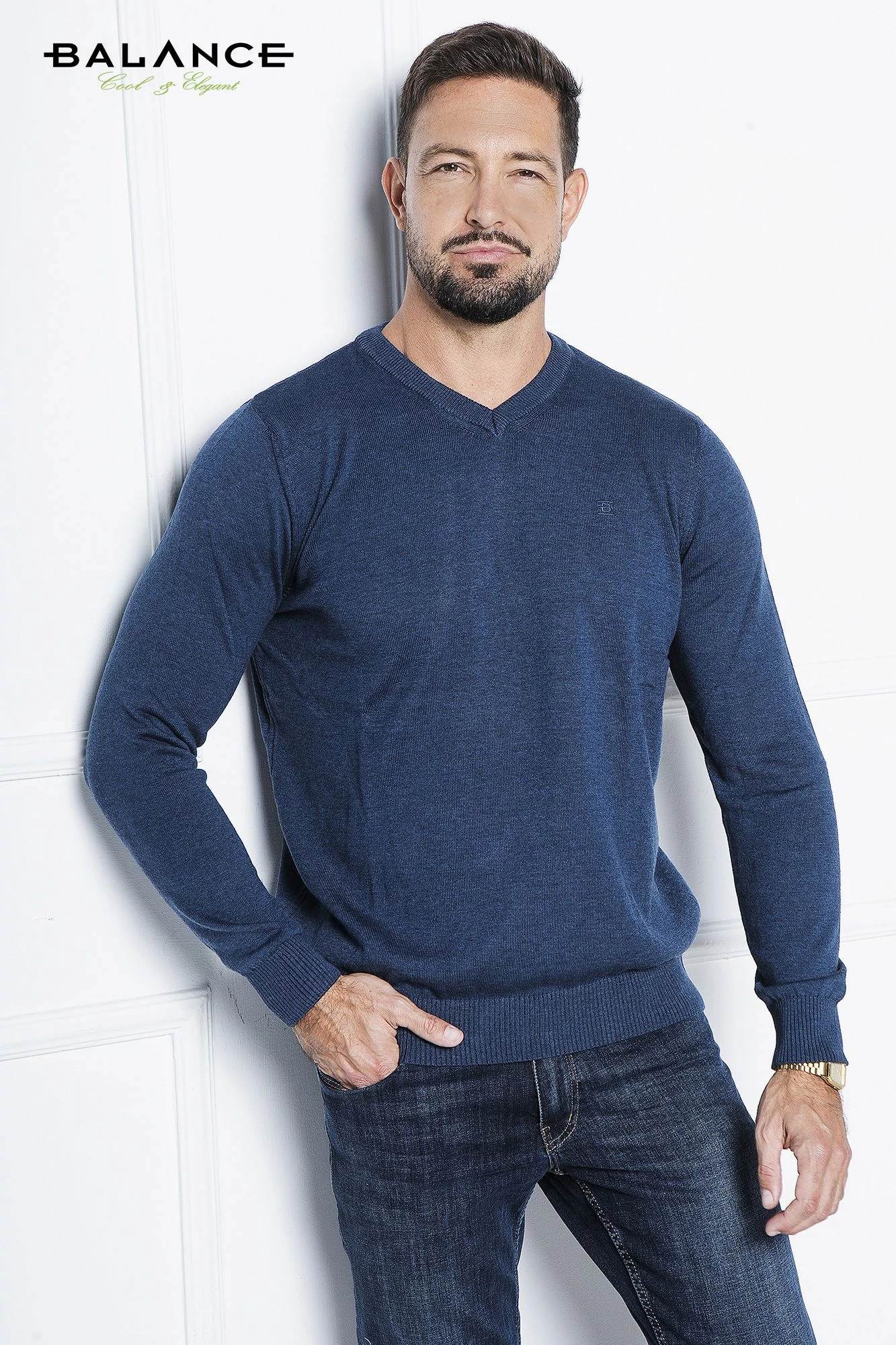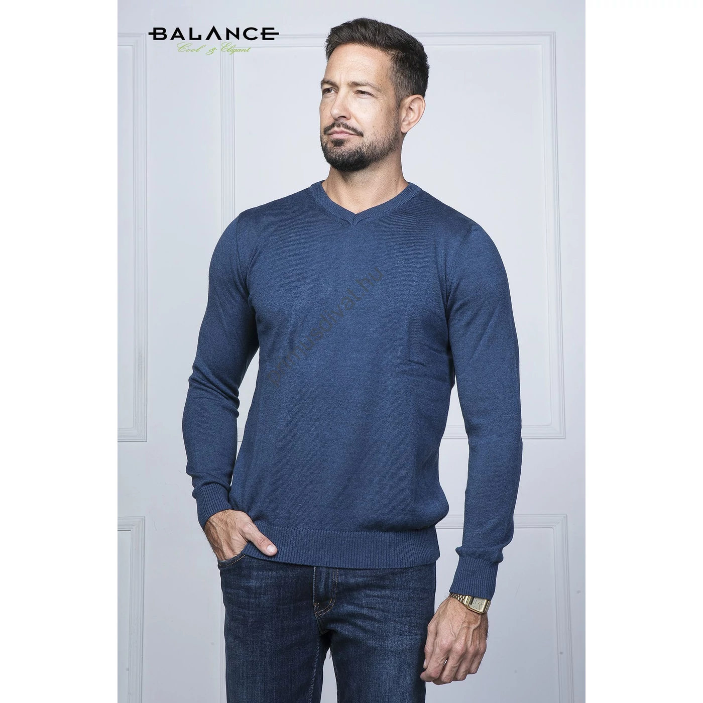 Vékony kötött, pamut anyagú, sötétkék-melange pulóver, V nyakkal, ujjain és derekán szűkebb passzé résszel, mellén szín-azonos hímzett Balance monogrammal. Önmagában, de akár ing főlé is viselhető, mivel nem teljesen testhez álló fazon. A modell 183 cm, 75kg, sportos testalkatú és L méretű pulóvert visel.