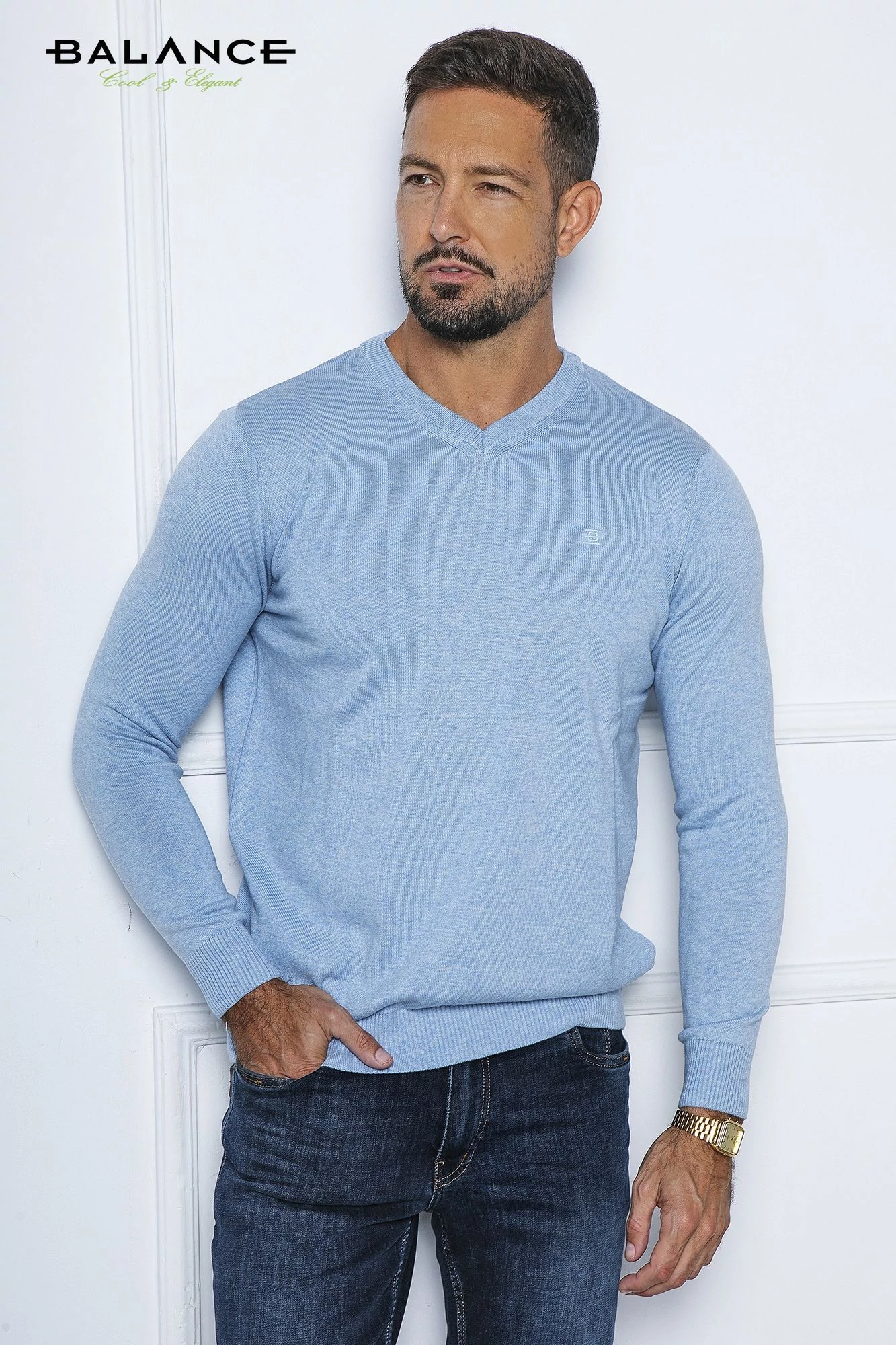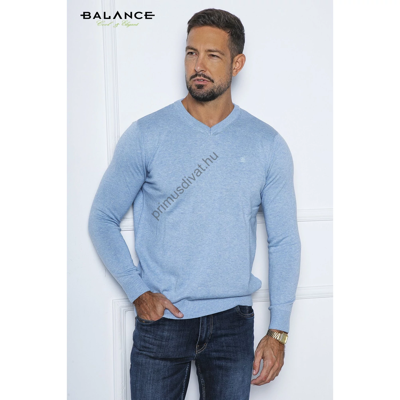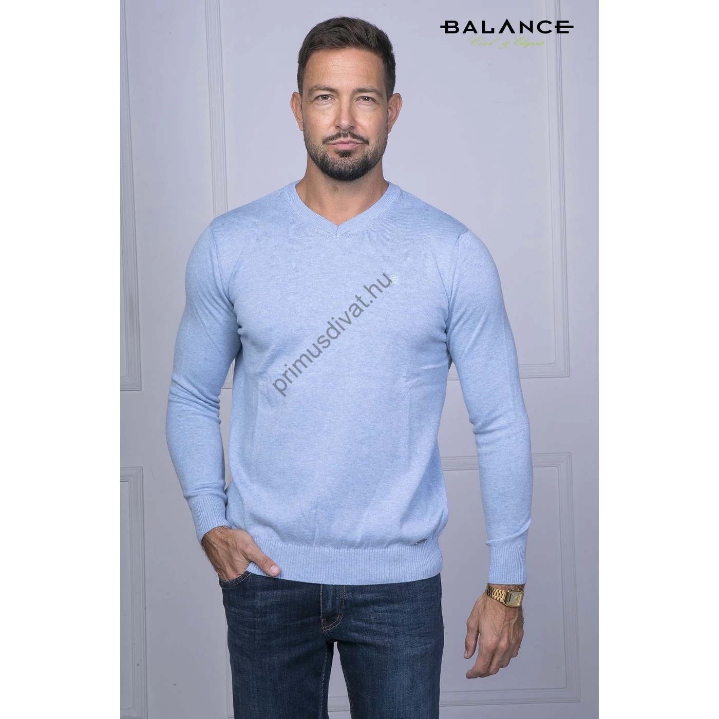 Vékony kötött, pamut anyagú, világoskék-melange pulóver, V nyakkal, ujjain és derekán szűkebb passzé résszel, mellén szín-azonos hímzett Balance monogrammal. Önmagában, de akár ing főlé is viselhető, mivel nem teljesen testhez álló fazon. A modell 183 cm, 75kg, sportos testalkatú és L méretű pulóvert visel.