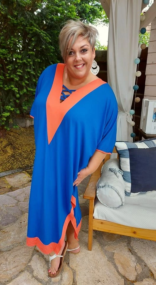 Fashion by Nono narancssárga betétes V-nyakú, keresztpántos dekoltázsú, két oldalt felsliccelt lenge királykék nyári Viki ruha, rugalmas vékony anyagú, belebújós fazon.