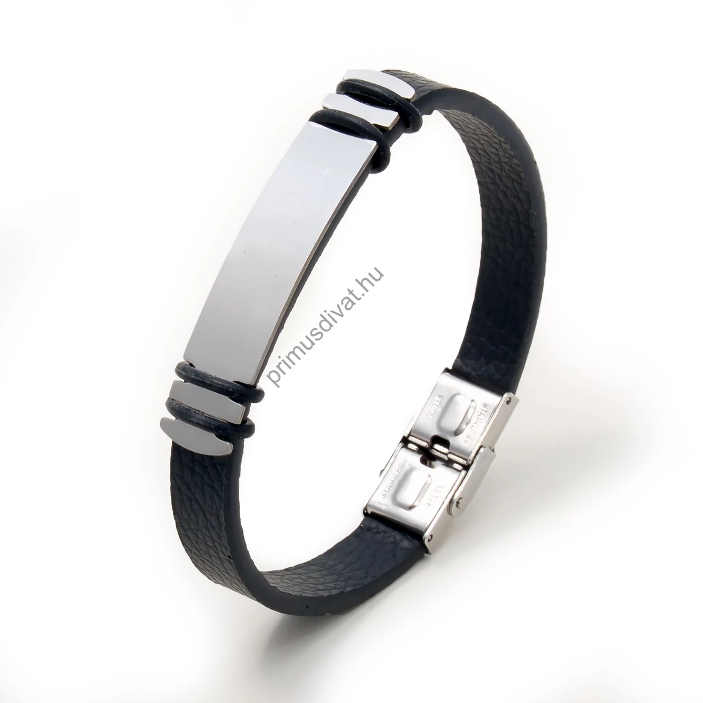 Fekete bőr férfi karkötő, ezüst színű gravírozható acél dísszel, kapcsos záródással. 20,5 cm hosszú (rövidíthető), 1 cm széles. A termék a csatrésznél házilagosan, egyszerű módon rövidíthető. Elegáns és stílusos kiegészítő a modern férfiak számára, kifinomult eleganciával egészíti ki az outfiteket, legyen szó hétköznapi vagy alkalmi viseletről.