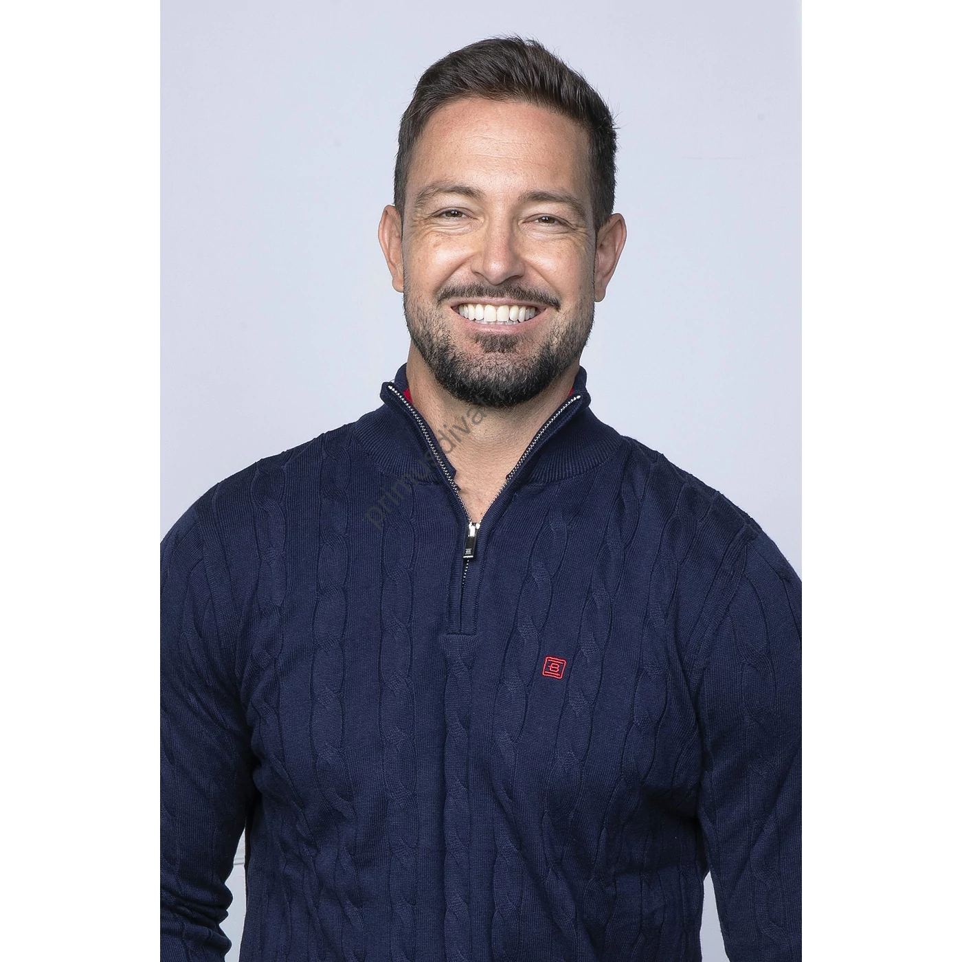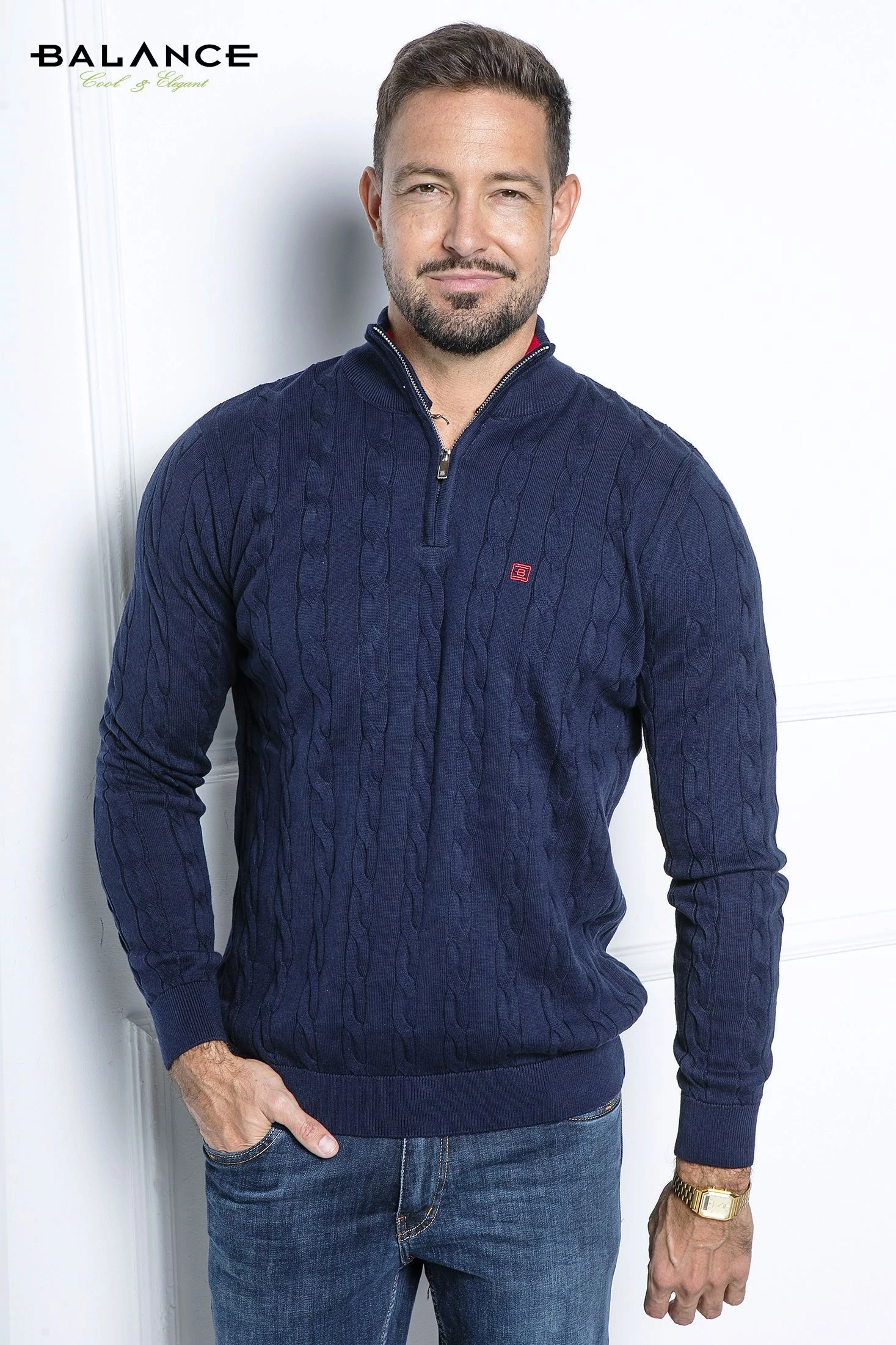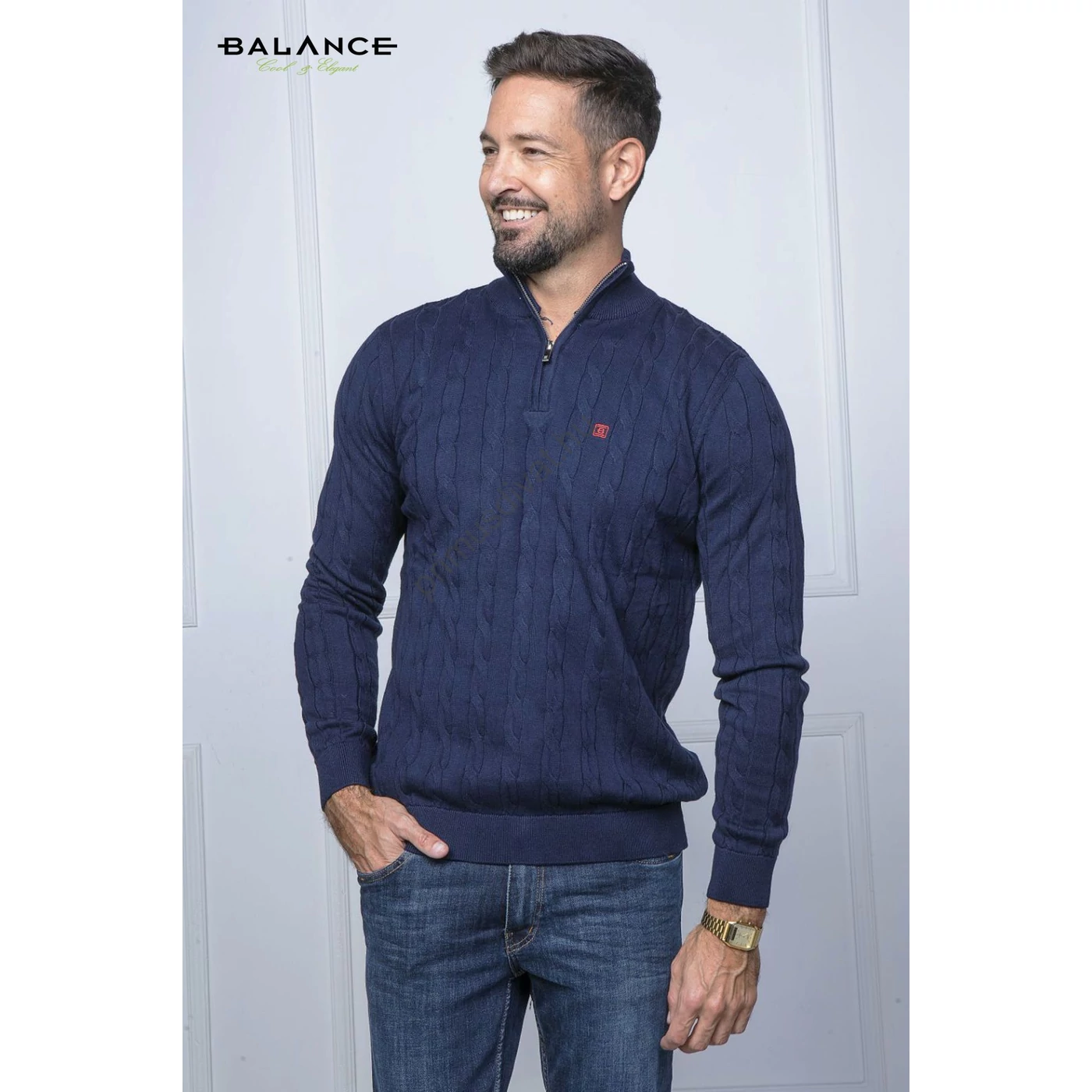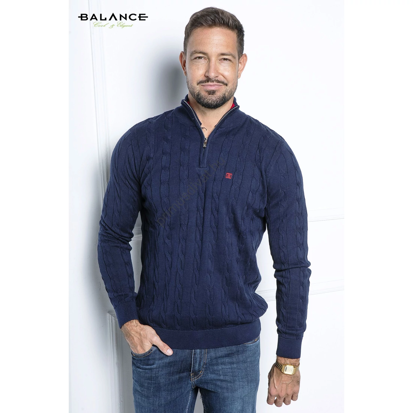 Balance cipzáras nyakú, állógalléros, fonott mintás kötött sötétkék Fonner pulóver, ujjain és derekán szűkebb passzé résszel, nyaka belső oldalán kontrasztos színű kötéssel, mellén szolid hímzett Balance monogrammal. Gallérja letűrhető, önmagában, de akár ing fölé is viselhető. A modell 183 cm, 75kg, sportos testalkatú és L méretű pulóvert visel.