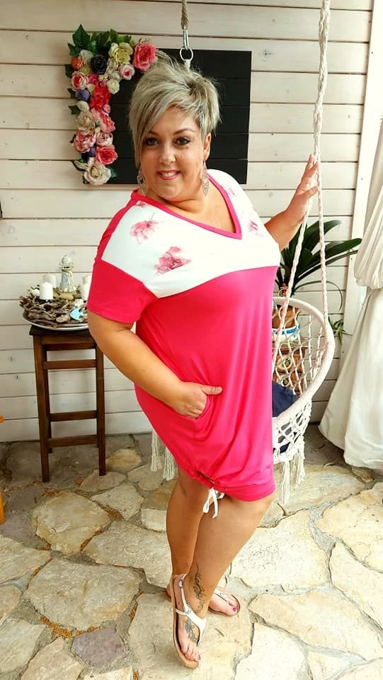 Fashion by Nono V-nyakú, két oldalán behúzott kötővel ráncolható, aszimmetrikus betétes pink Zoé tunika, miniruha, rugalmas vékony anyagú, belebújós fazon.