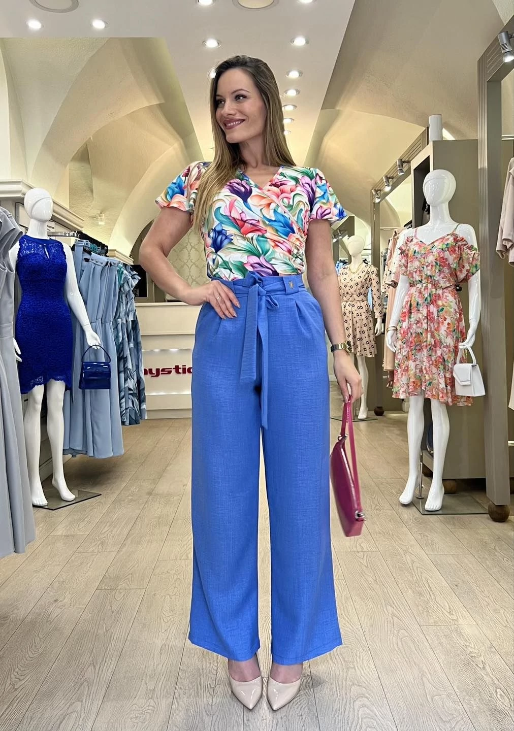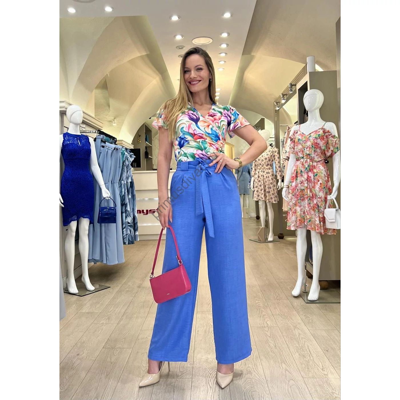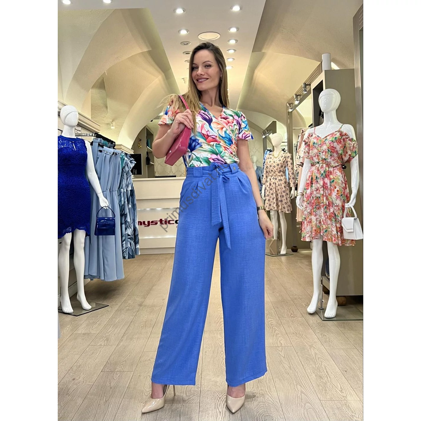 Mystic Day bő szárú, lenes hatású, vékony, szellős anyagú, középkék színű Rimini nadrág, anyagából készült megkötős övvel. A termék hosszánál kérjük vegye figyelembe, hogy a modell 175 cm magas és S méretet visel.