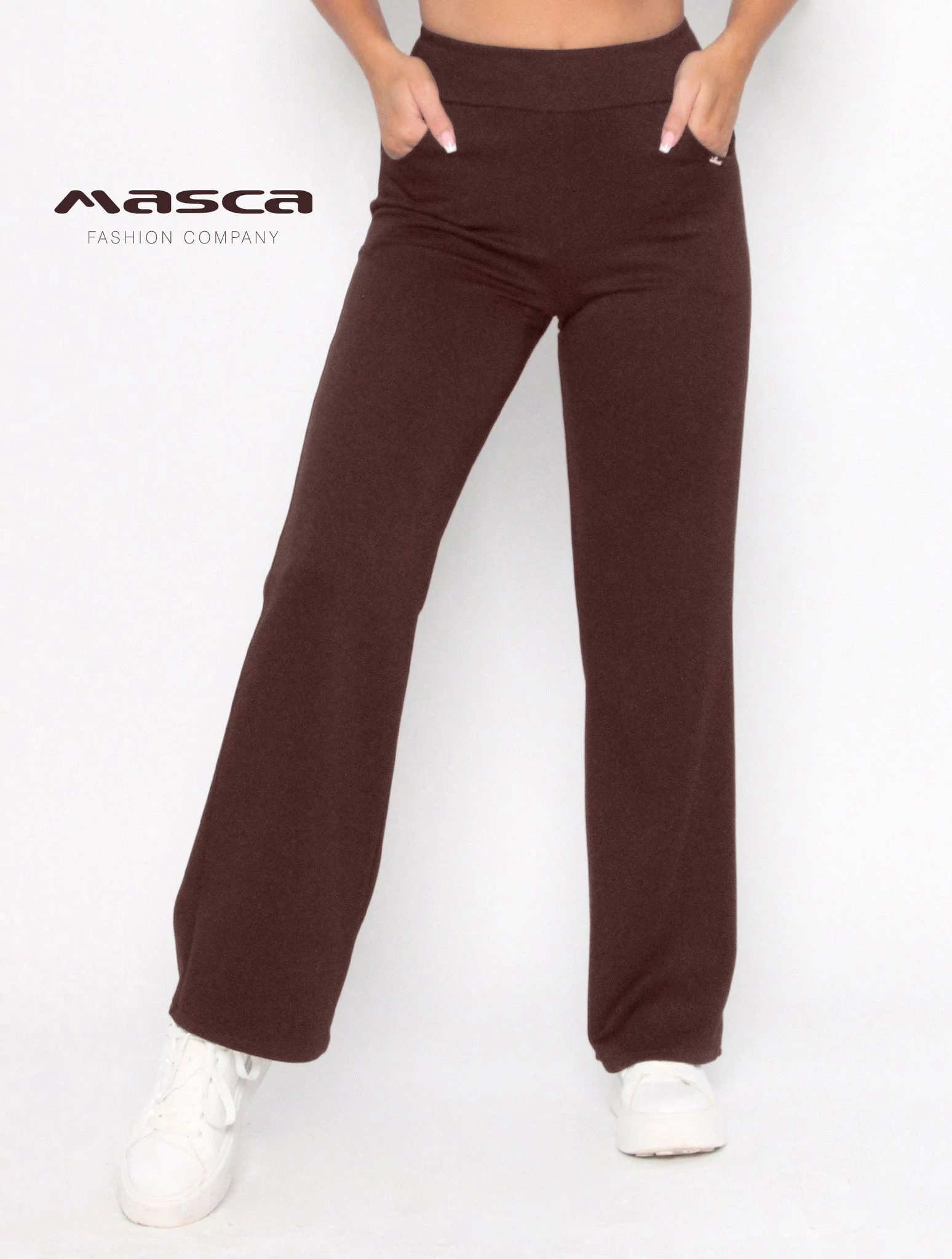 Masca Fashion sötétbarna, gumis derekú zsebes, bő szárú rugalmas punto anyagú nadrág.