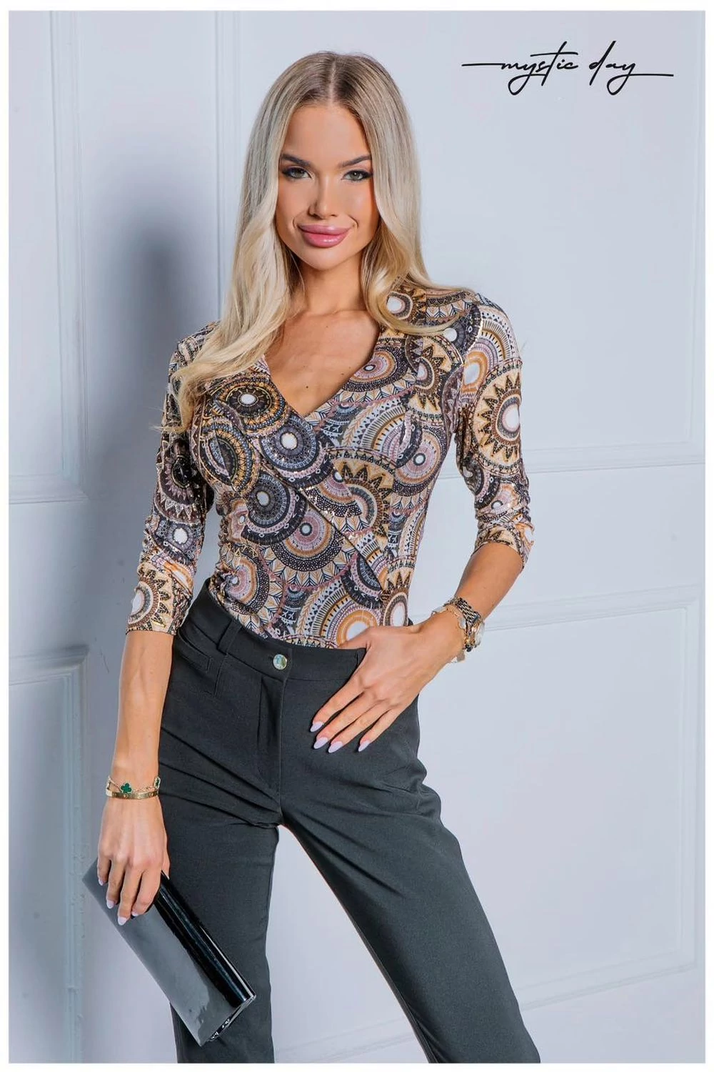 Mystic Day arany színnel kontúrozott őszi színtónusú mandala mintás, háromnegyedes ujjú szűk felső, jobb oldalán gallérral, könnyen kezelhető, selymes tapintású anyagból.