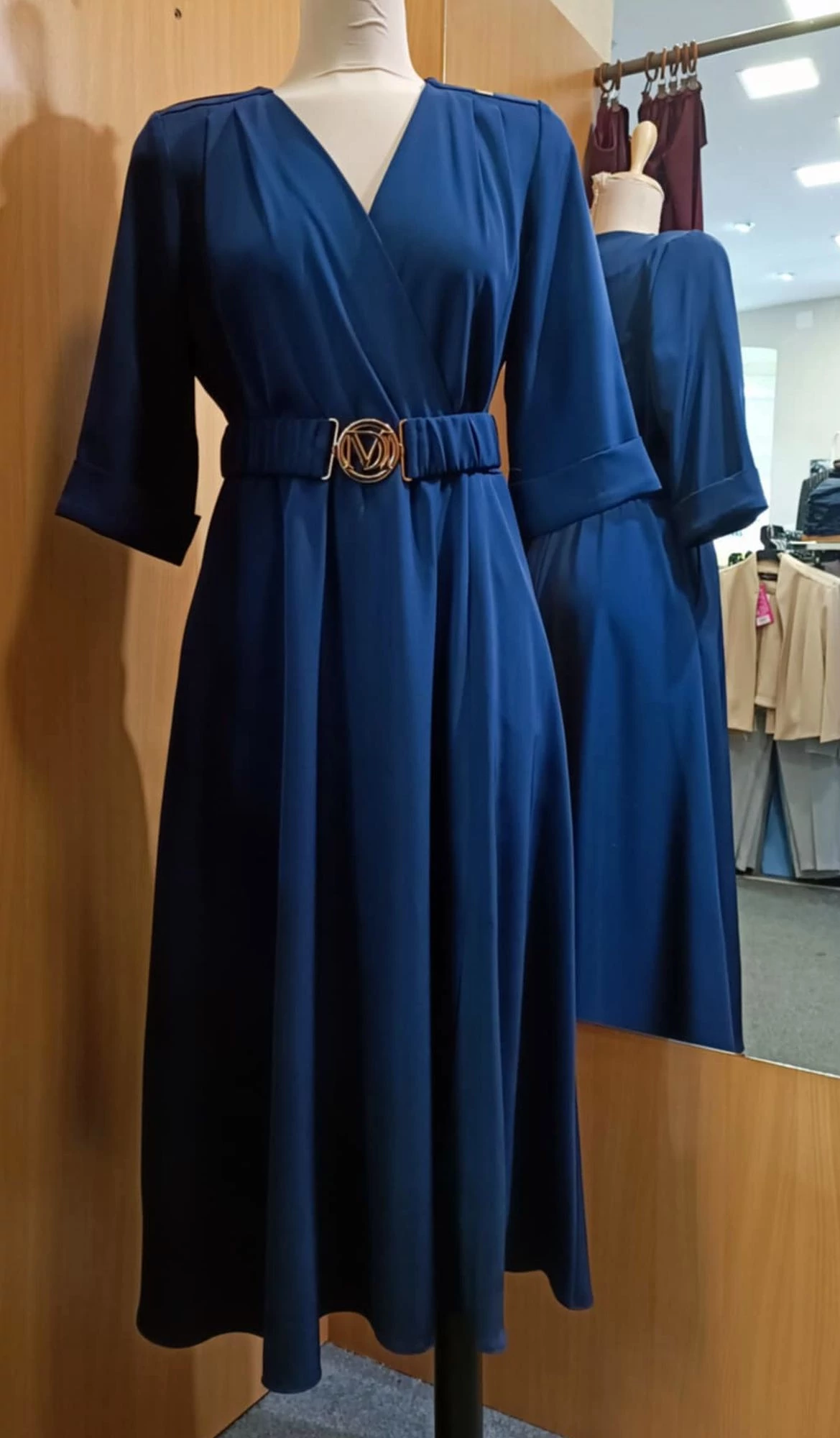 Mystic Day átlapolt dekoltázsú, gumis derekú lefelé bővülő, háromnegyedes ujjú sötétkék Gréti alkalmi ruha zsebekkel, bal alján felsliccelve, anyagából készült csatos övvel - Md25-141