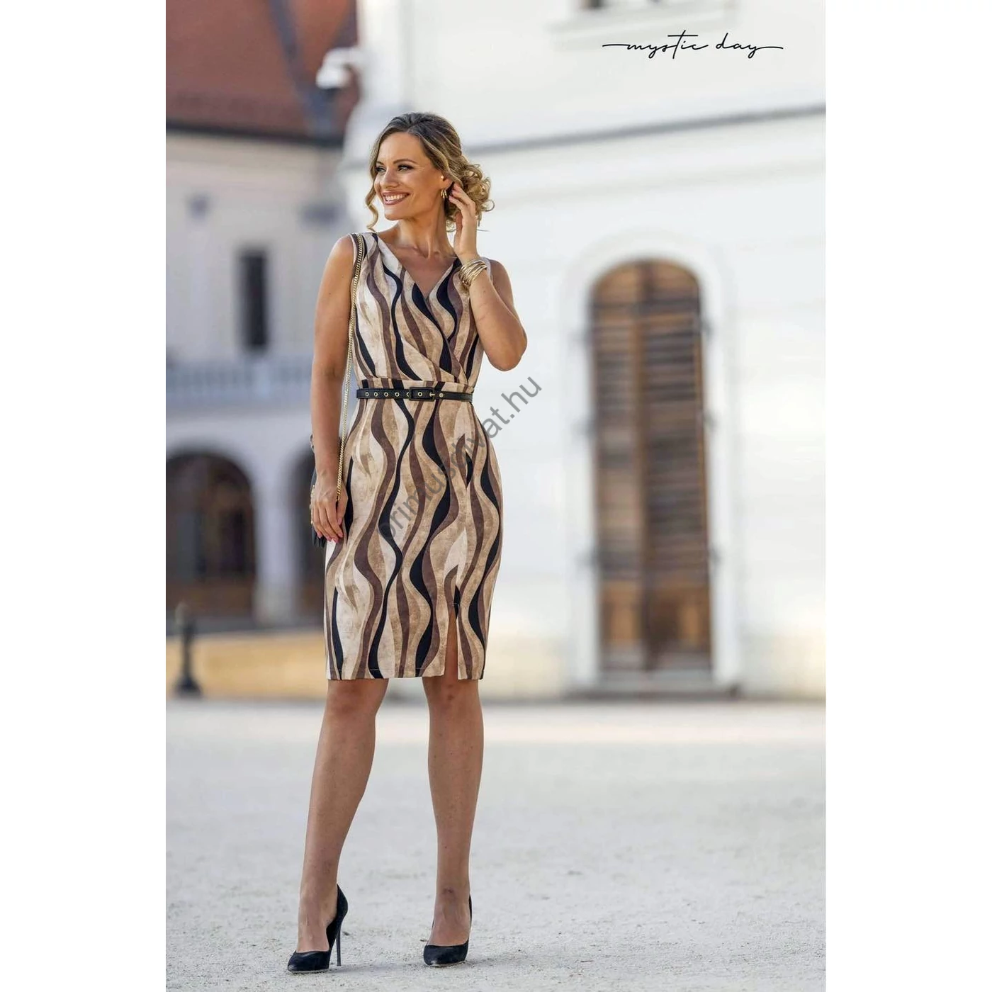 Mystic Day átlapolt elejű, drapp-fekete hullám mintás ujjatlan Lujza ruha, fekete csatos övvel - Md24-004